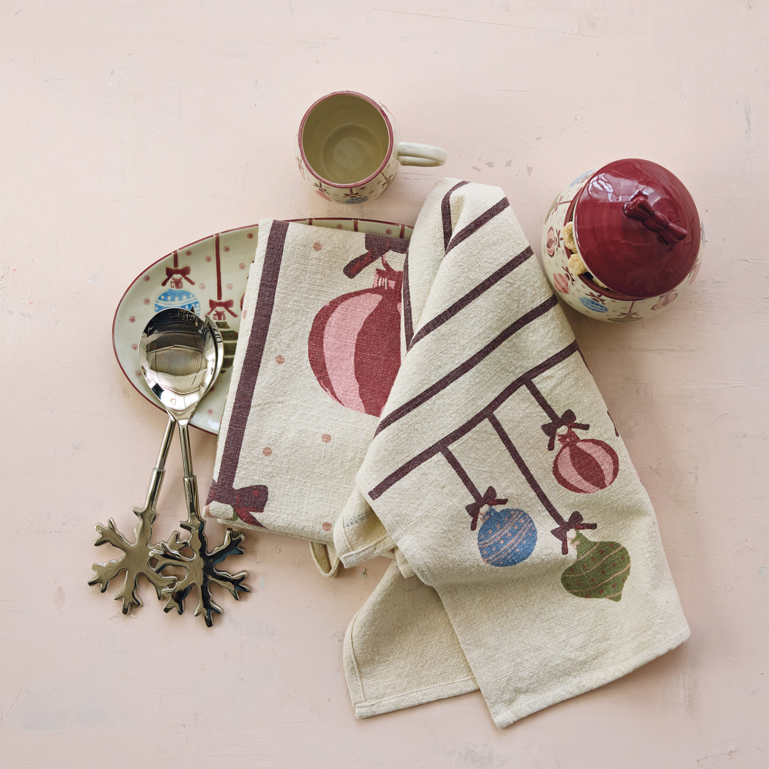 Woven Cotton Printed Tea Towel with Pattern & Ornaments, 2 Styles