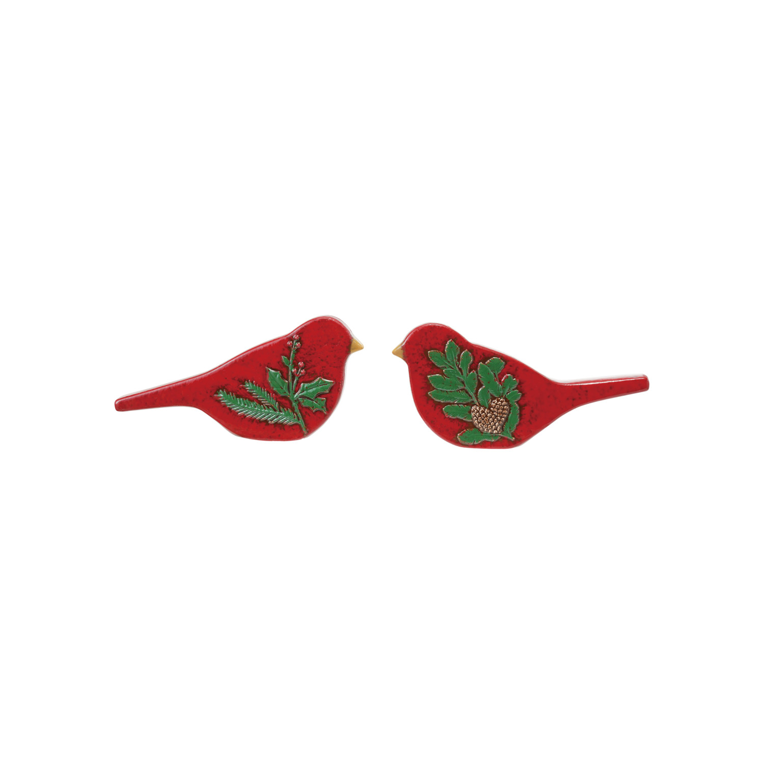 Catalog Name: 6"L x 2-3/4"H Hand-Painted Embossed Ceramic Bird w/ Botanical, Reactive Glaze, Red & Green/Brown, 2 Styles (Each One Will Vary)