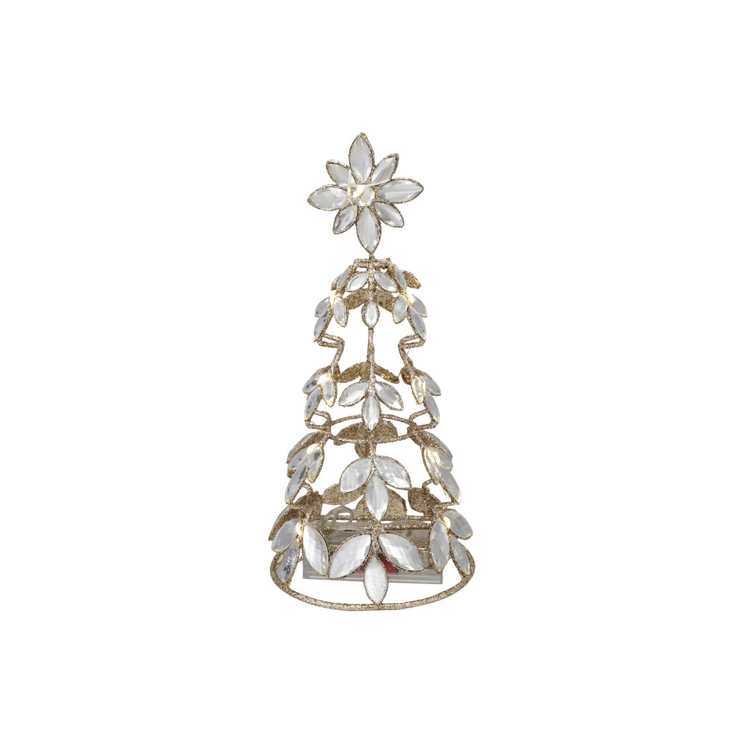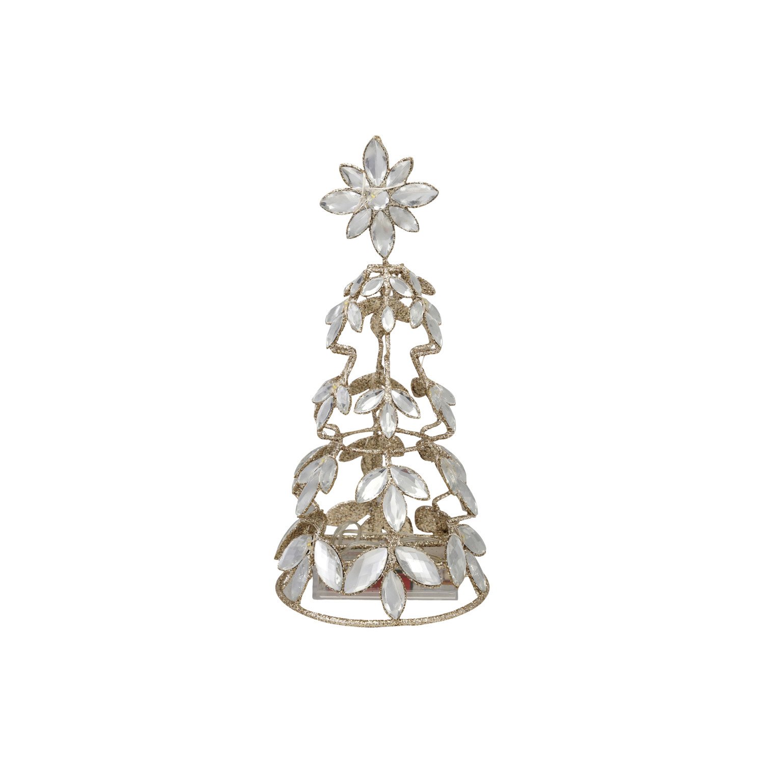 Catalog Name: 4-1/2" Round x 10-1/4"H Metal Tree w/ Acrylic Jewels, Glitter & LED Light, Champagne Finish (Requires 3-AA Batteries)