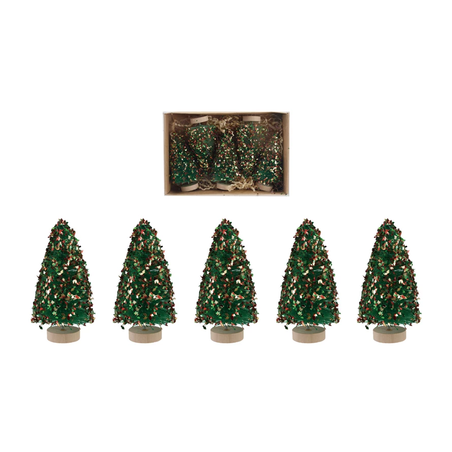 Catalog Name: 4"H Sisal Bottle Brush Trees w/ Glitter & Wood Bases, Multi Color, Boxed Set of 5