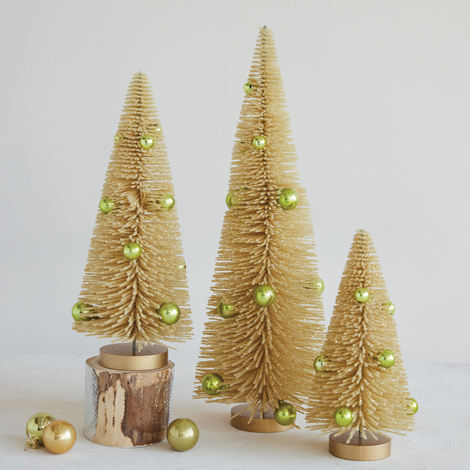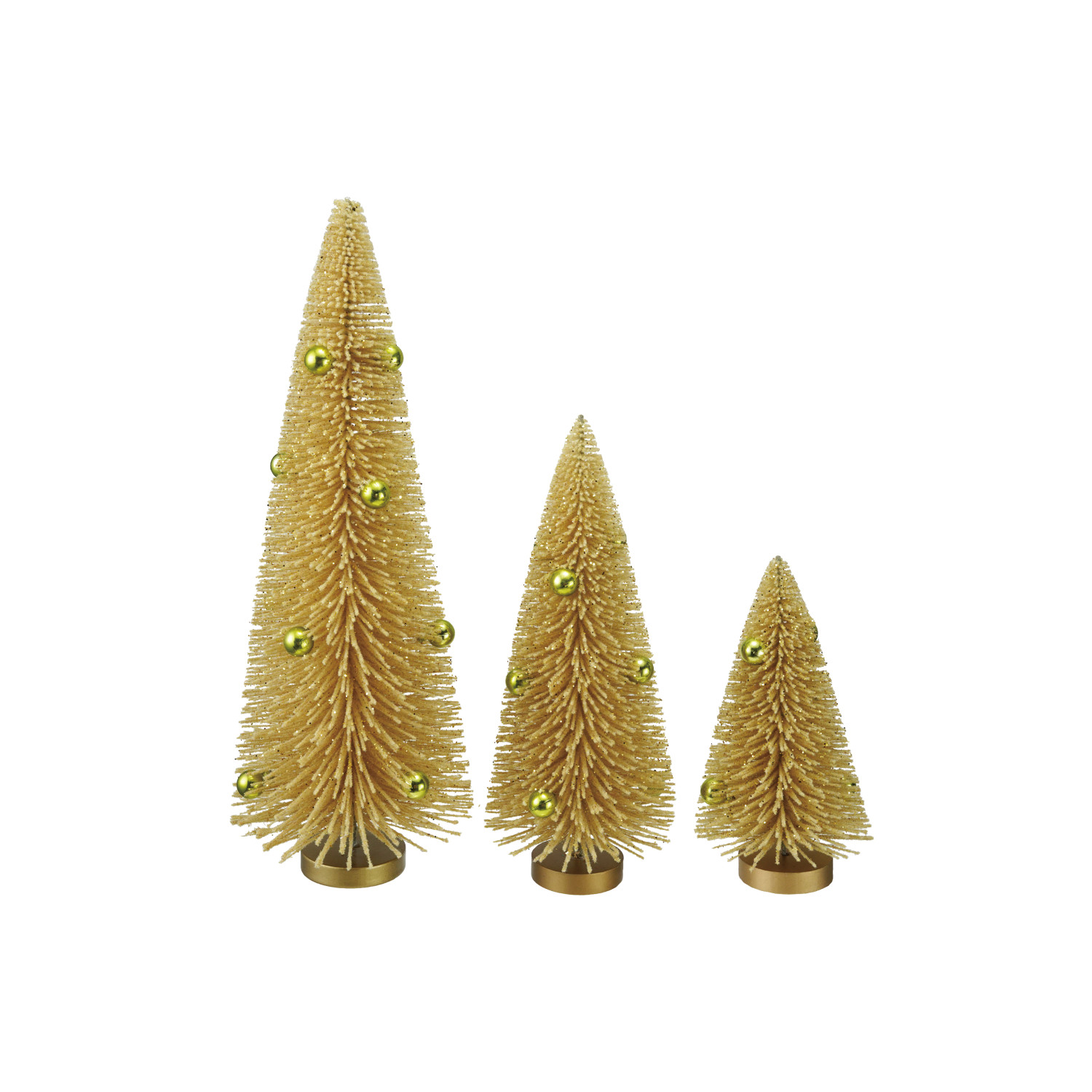 Catalog Name: 6-3/4" Round x 18-1/2"H, 5-1/4" Round x 12-1/2"H & 4-3/4" Round x 9"H Plastic Bottle Brush Trees w/ Ornaments, Glitter & MDF Bases, Cream Color & Green, Set of 3