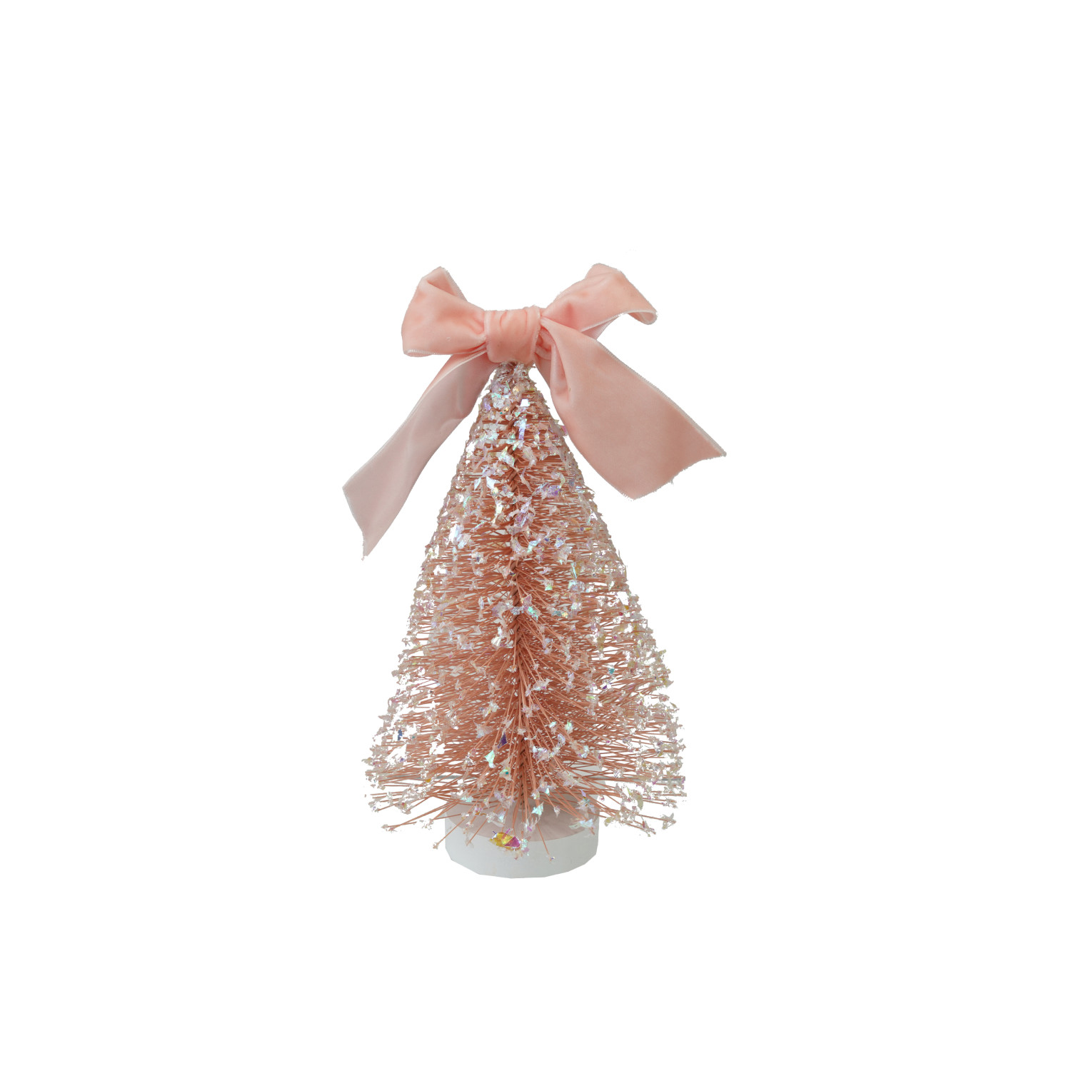 Catalog Name: 5" Round x 8"H Plastic Bottle Brush Tree w/ Glitter, Velvet Bow & MDF Base, Snow Finish, Pink