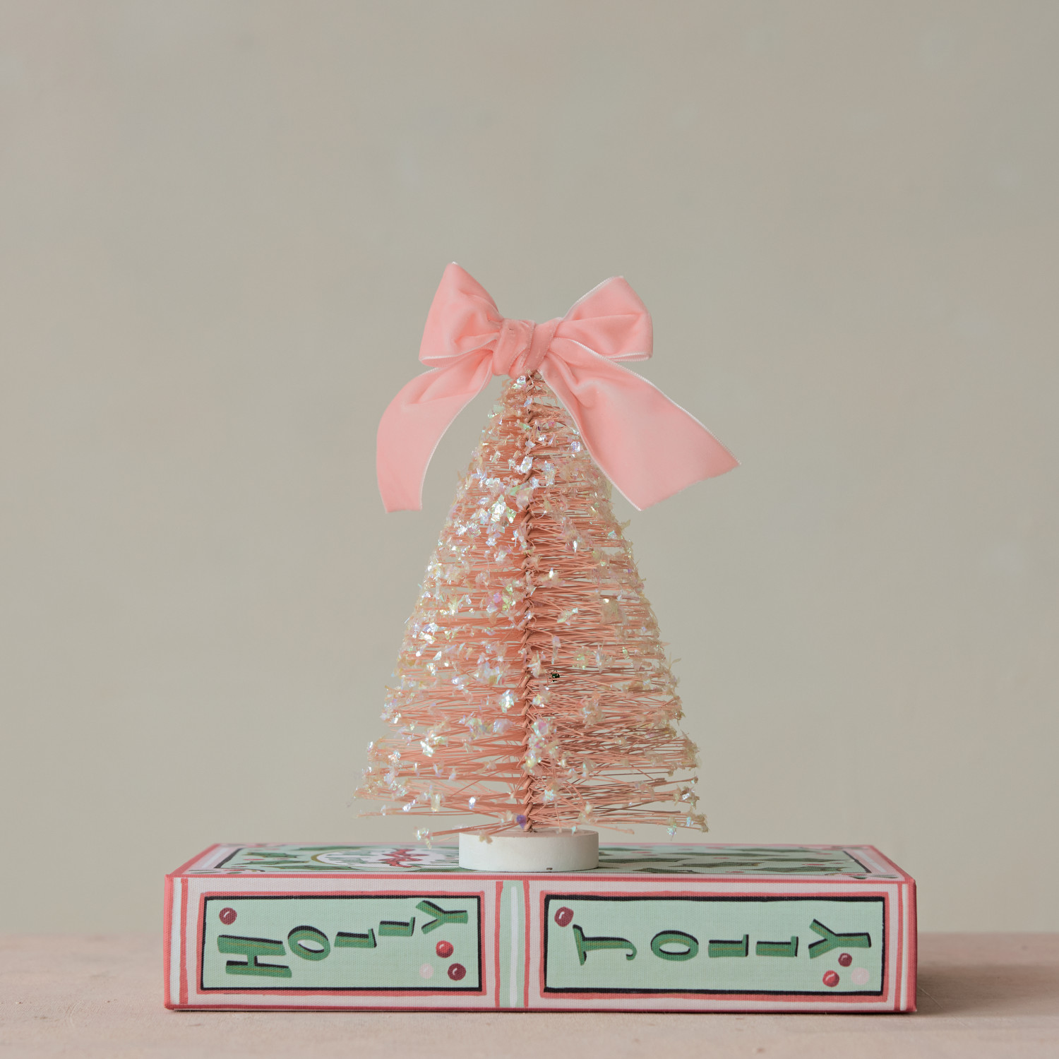 Plastic Bottle Brush Tree with Glitter, Velvet Bow & MDF Base, Snow Finish, Pink