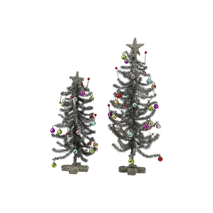 Catalog Name: 6-1/2" Round x 12-1/2"H & 5" Round x 9-1/2"H Tinsel & MDF Vintage Reproduction Trees w/ Ornaments & Glitter Star/Base, Multi Color, Set of 2