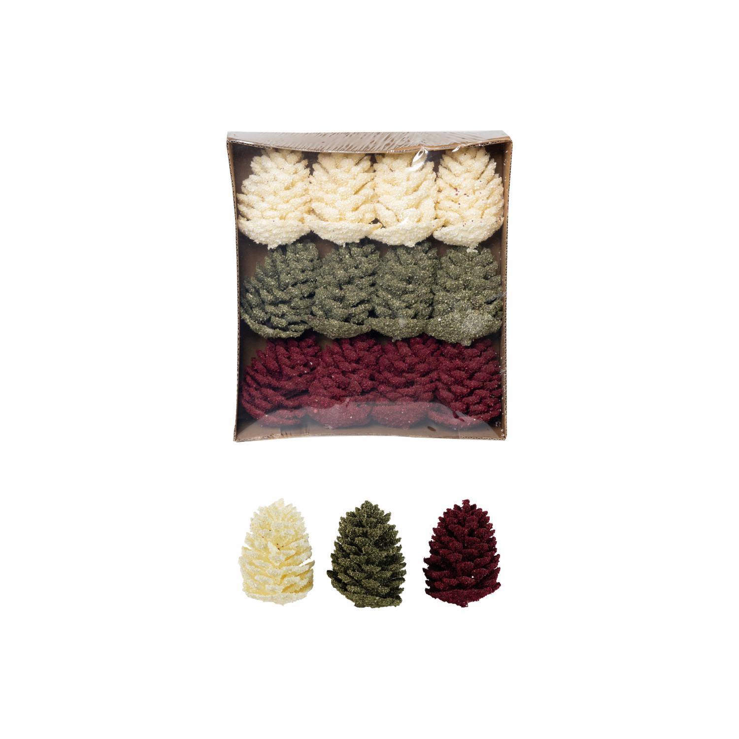 Catalog Name: 4" Round x 5"H Faux Pinecones w/ Glitter, Burgundy, Green & Cream Color, Boxed Set of 9