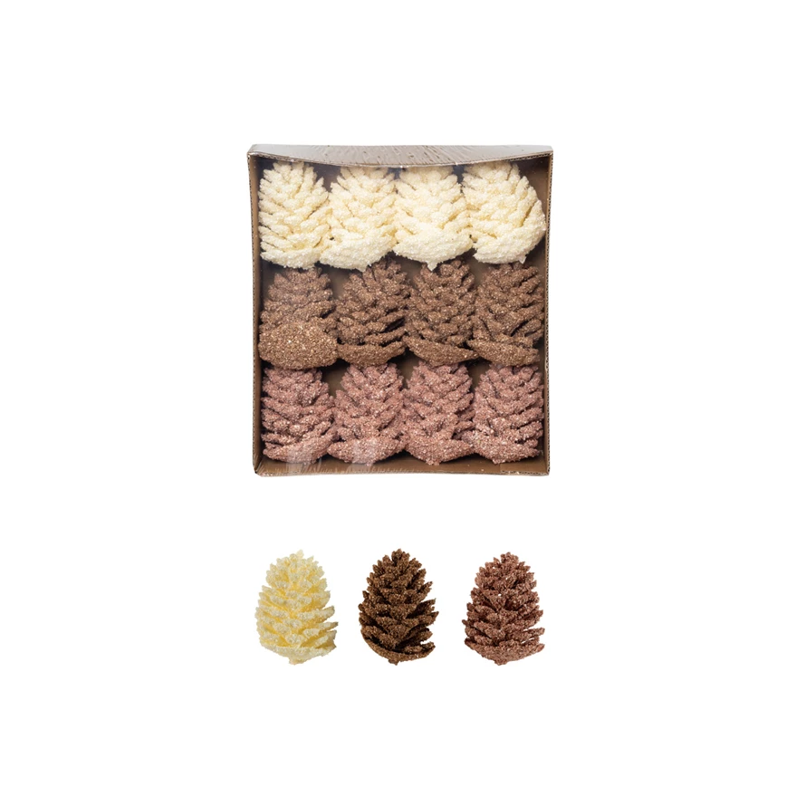 Faux Pinecones with Glitter, Pink, Brown & Cream Color, Boxed Set of 9