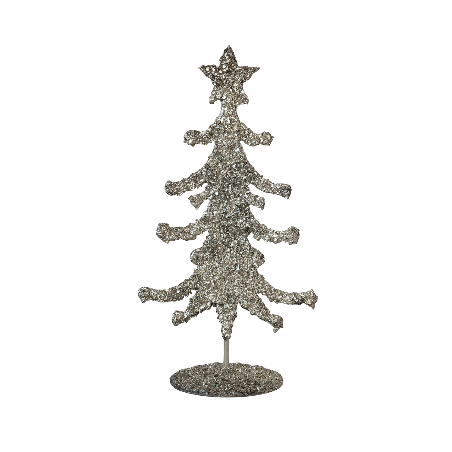 Catalog Name: 6-1/2" Round x 11-3/4"H Metal Tree w/ Mica Flakes & Star, Antique Silver Finish