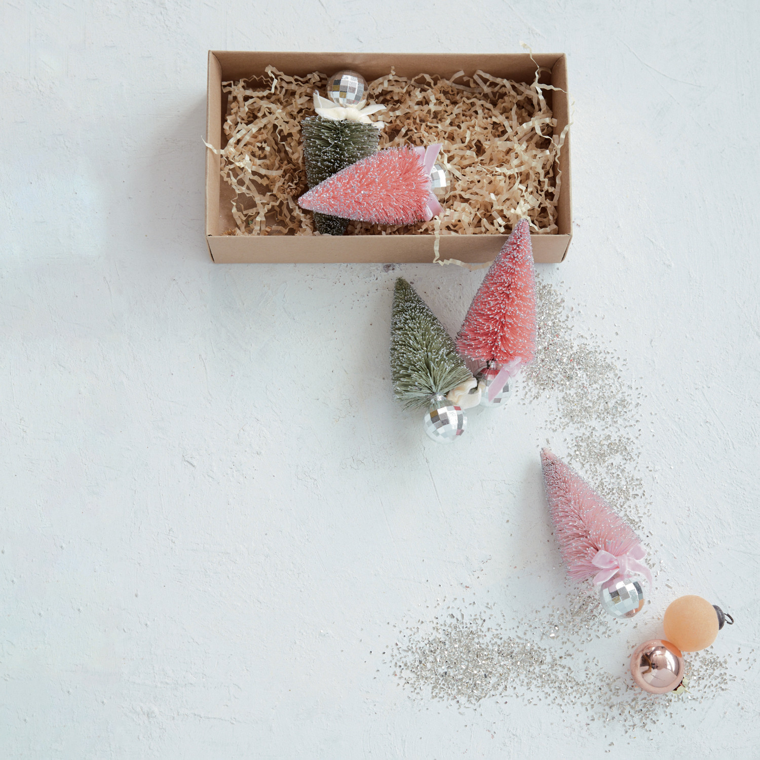 Sisal Bottle Brush Tree Ornaments with Plastic Mirror Ball Bases & Bows, Boxed Set of 5