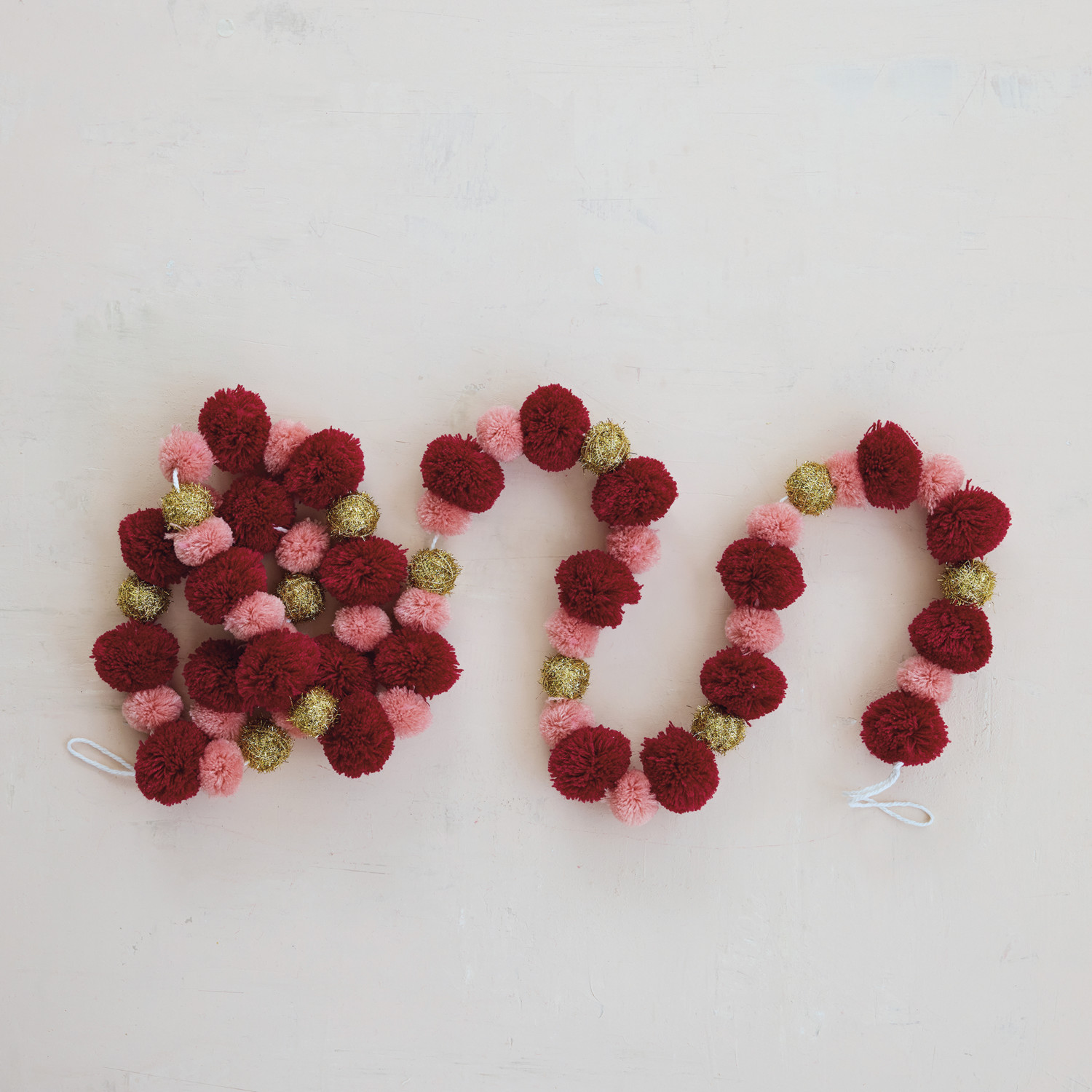 Fabric Pom Pom Garland, Gold Finish, Burgundy & Pink