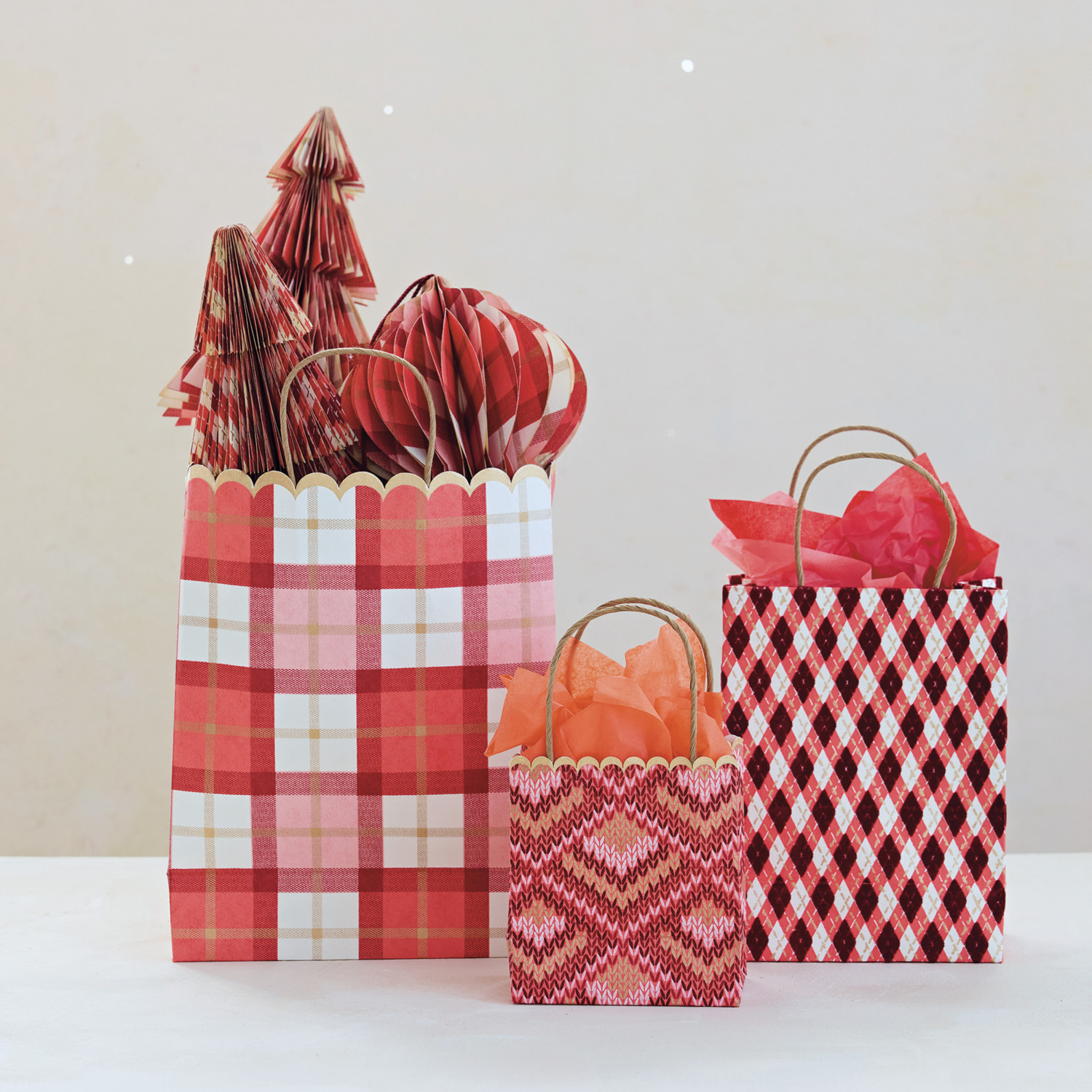 Handmade Printed Scalloped Recycled Paper Gift Bags with Patterns, Set of 3
