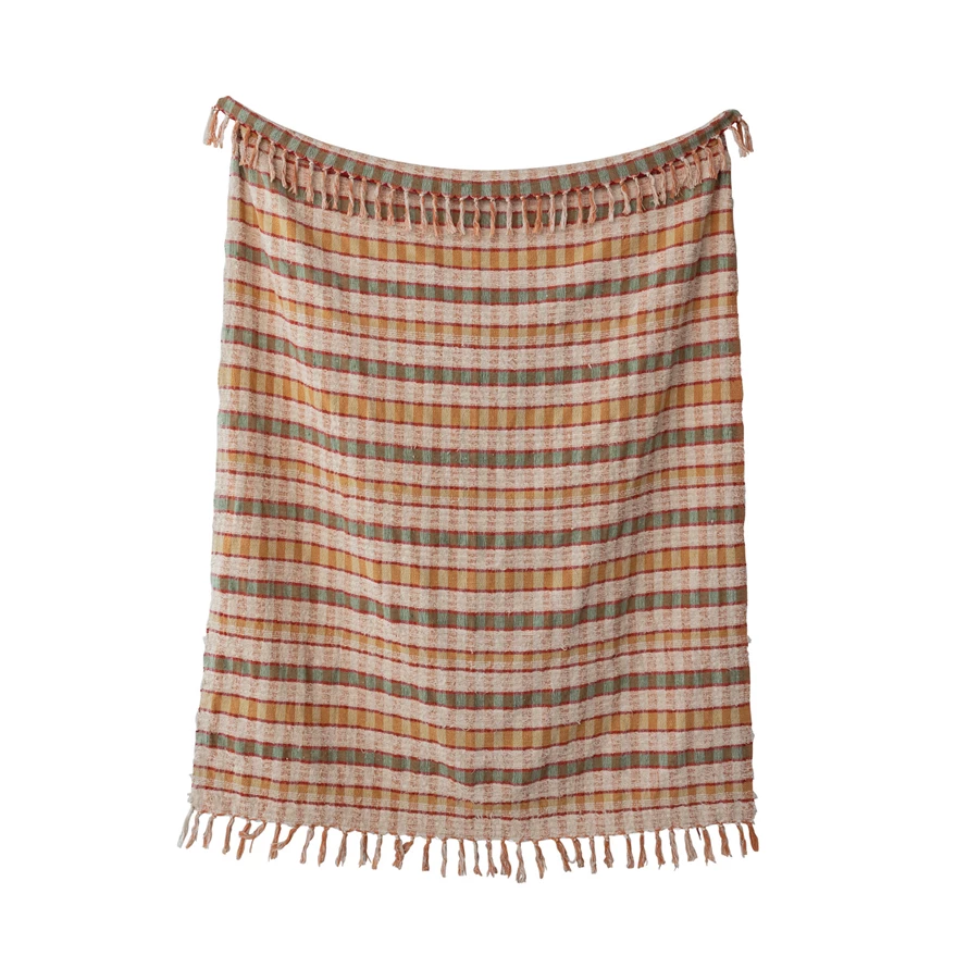 Woven Cotton Slub & Wool Striped Throw with Fringe