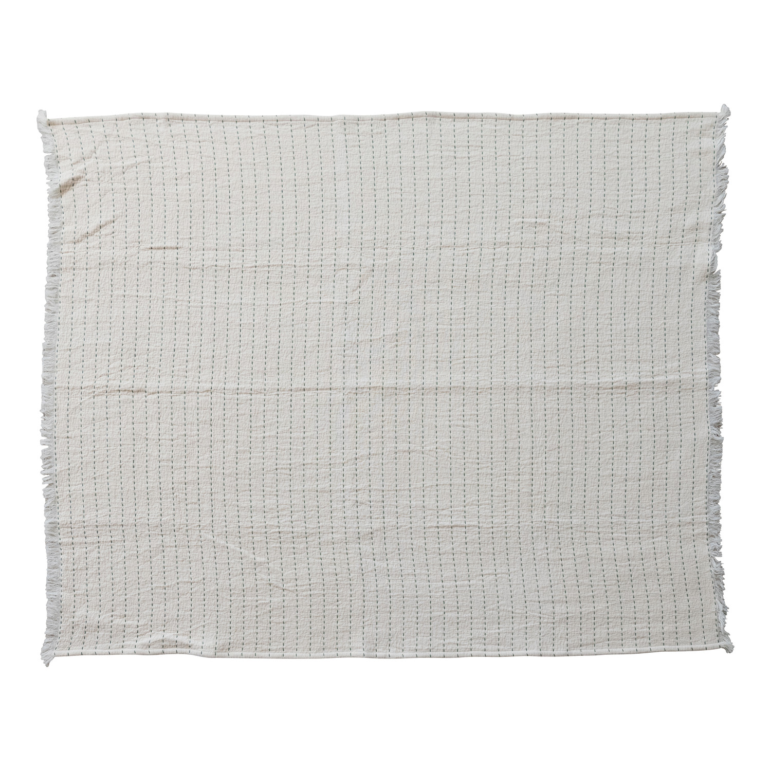 Catalog Name: 60"L x 50"W Slub Throw w/ Hand-Embroidered Kantha Stitch & Frayed Edges, Natural & Green