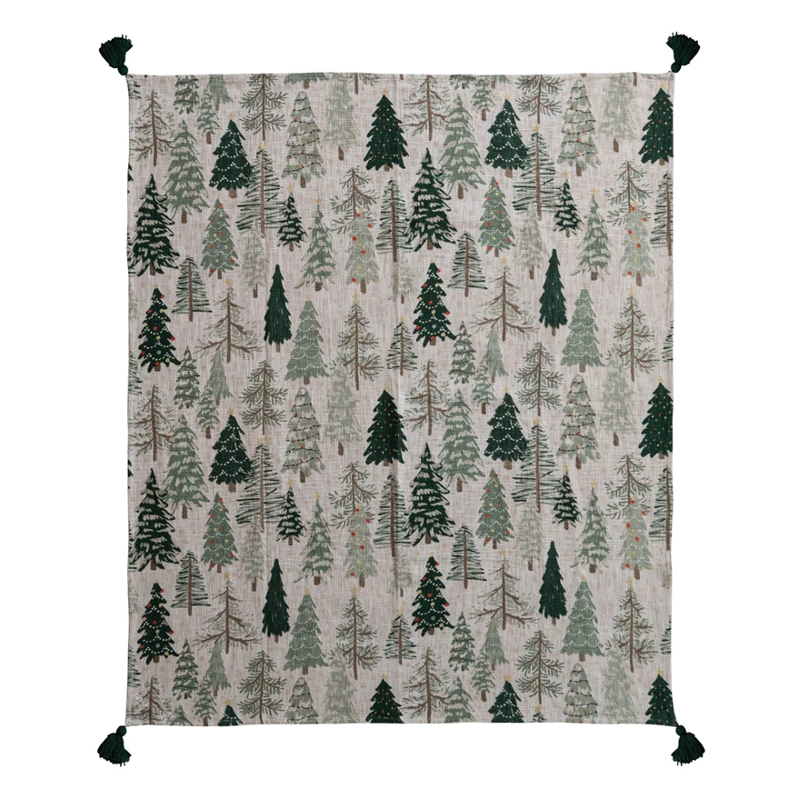 Catalog Name: 60"L x 50"W Cotton Printed Throw w/ Tree Pattern & Tassels, Multi Color