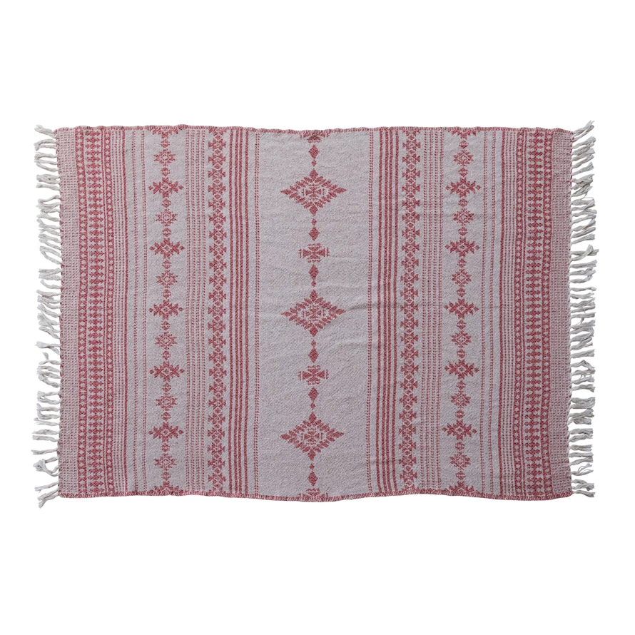 Catalog Name: 60"L x 50"W Woven Recycled Blend Throw w/ Fair Isle Sweater Pattern & Fringe, Cream Color & Red