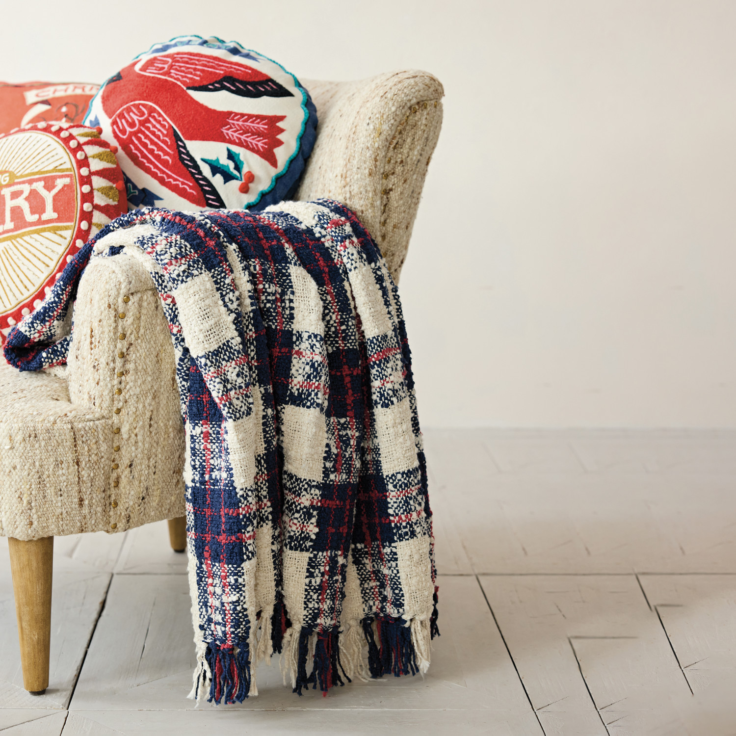 Woven Cotton Throw with Buffalo Check Pattern & Fringe, Navy Color, Red & Natural