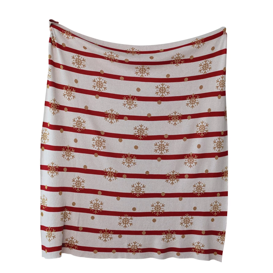 Cotton Knit Throw with Stripes, Snowflakes & Dots Pattern, Natural, Red & Gold Color