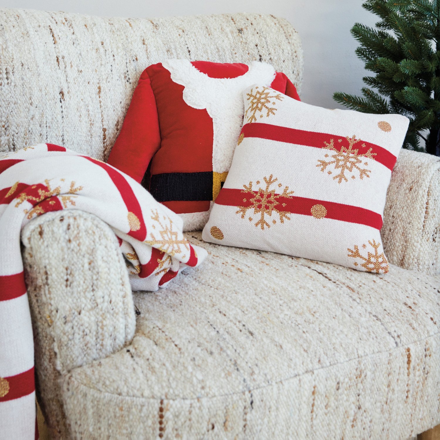 Catalog Name: 60"L x 50"W Cotton Knit Throw w/ Stripes, Snowflakes & Dots Pattern, Natural, Red & Gold Color