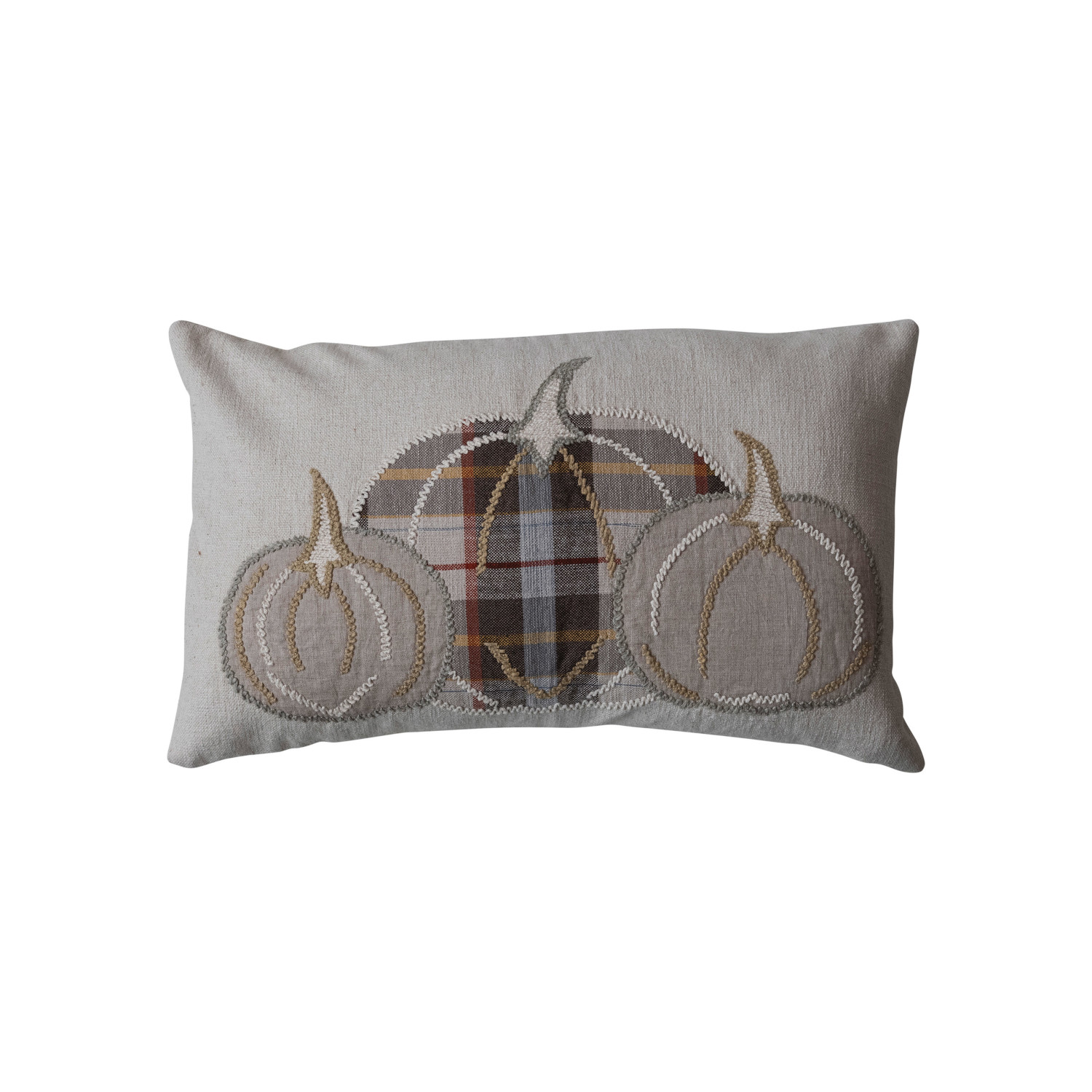 Catalog Name: 24"L x 14"H Cotton & Linen Slub Lumbar Pillow w/ Appliqued Pumpkins & Chambray Back, Natural & Multi Color Plaid