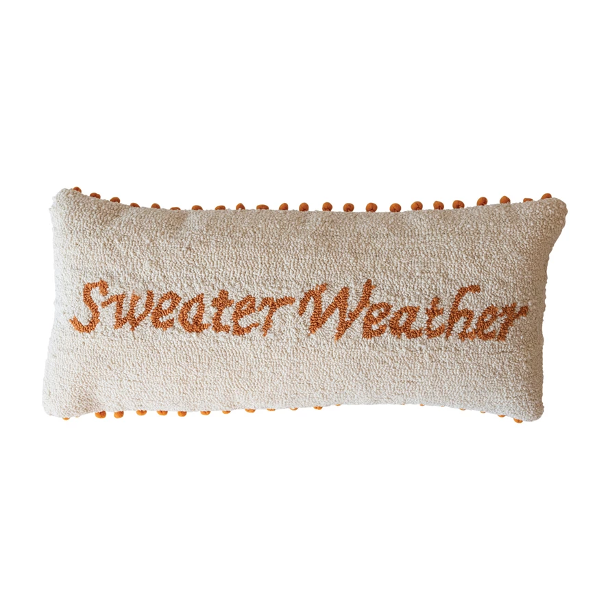 This cotton blend lumbar pillow, adorned with a "Sweater Weather" tufted design and pom pom trim, captures the essence of cozy autumn days. The natural and mustard color palette, along with the cream and orange hues, adds warmth to any room. The cotton blend cover and polyester fill provide a perfect combination of softness and durability, making it not just a decorative piece but also a comfortable addition to the home. Its generous size makes it an ideal choice for bringing a touch of the season's comfort to the living space. Whether it's enhancing a sofa or inviting relaxation in a favorite chair, this pillow is a snug celebration of sweater weather charm.
