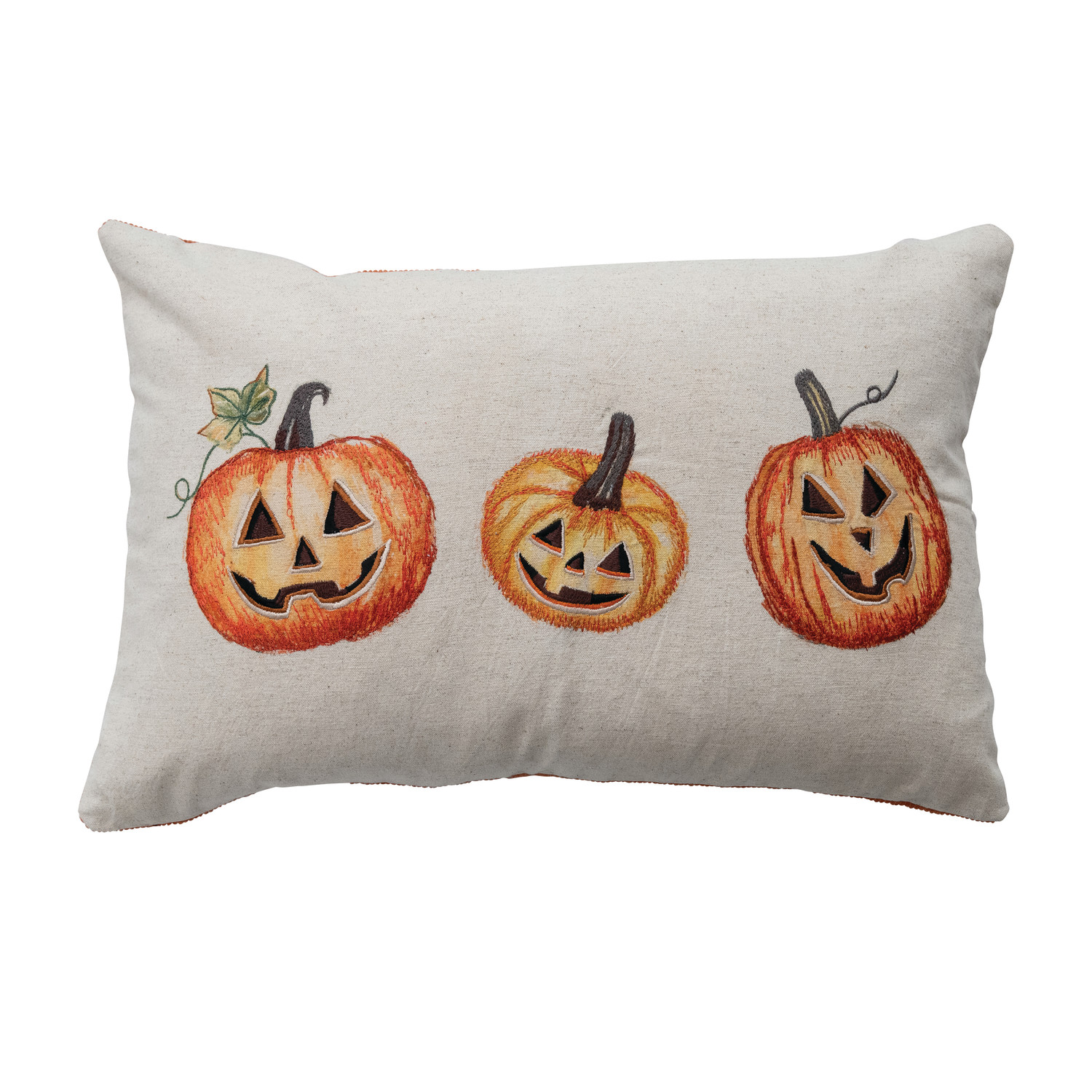Catalog Name: 24"L x 16"H Cotton & Linen Printed Lumbar Pillow w/ Jack-O-Lanterns, Embroidery & Corduroy Back, Multi Color ©