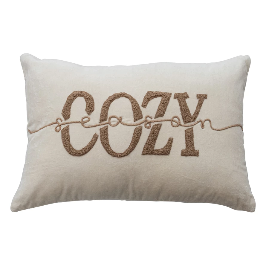 Catalog Name: 24"L x 16"H Woven Cotton Blend Velvet Lumbar Pillow w/ Tufted "Cozy" & Hand Embroidered Jute "Season", Cream Color & Natural