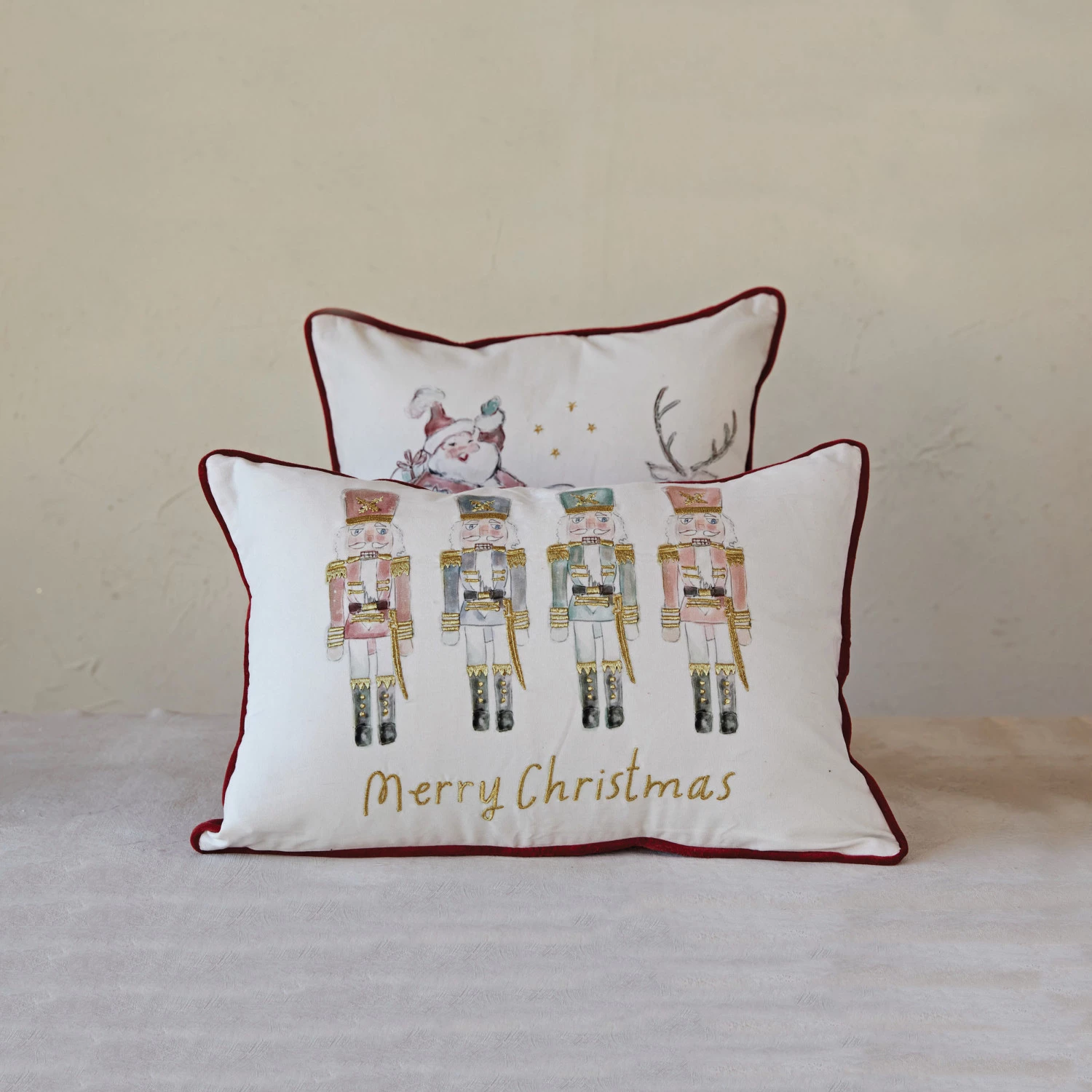 This vintage-inspired cotton throw pillow features an illustration of Santa and his reindeer-drawn sleigh, finished with embroidered detail and velvet piping. Celebrate the holidays in style with our charming collection of holiday throw pillows, featuring cozy designs from classic motifs to modern patterns, and luxurious materials to create a warm and inviting atmosphere.
