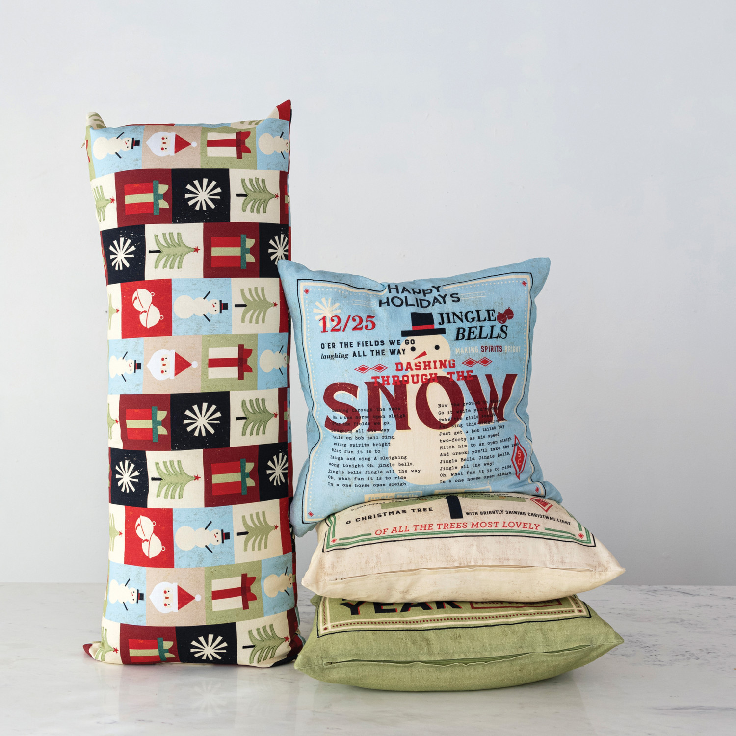 This cheerful cotton lumbar pillow features a playful block print with an array of holiday icons. Celebrate the holidays in style with our charming collection of holiday throw pillows, featuring cozy designs from classic motifs to modern patterns, and luxurious materials to create a warm and inviting atmosphere.