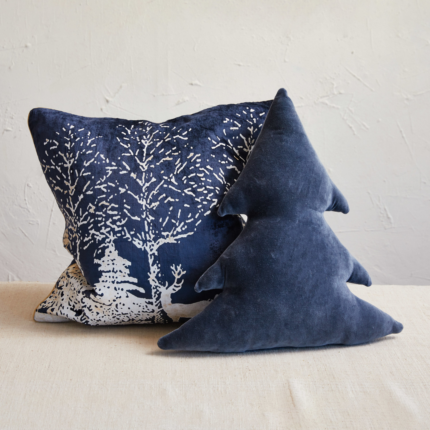 This square-woven cotton velvet tree-shaped pillow is a dreamy addition to any holiday home. The rich blue hue evokes the tranquility of a winter's night, while the tree shape adds a whimsical nod to the season's traditions. Crafted from the softest cotton velvet and filled with plush polyester, it's designed for comfort as much as style. Whether it's adding a pop of color to the sofa or serving as a charming accent on the bed, this pillow is sure to become a favorite for seasons to come. Its generous size and inviting texture make it the perfect companion for relaxing and unwinding during the festive period. A plush woven cotton velvet pillow, shaped like a festive tree and colored in a serene shade of blue. An elegant piece that adds a touch of winter calm to any decor, perfect for a cozy and stylish holiday season. Polyester fill insert included.