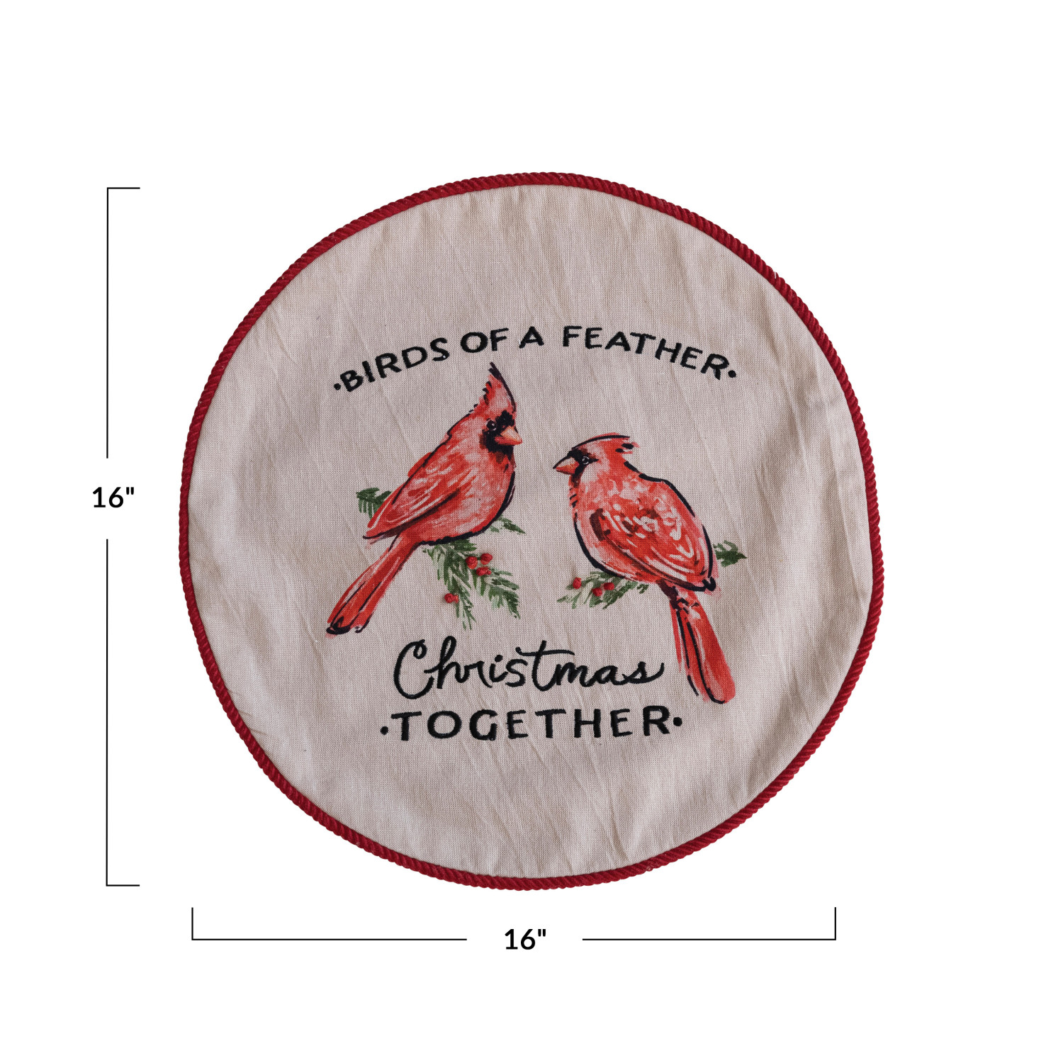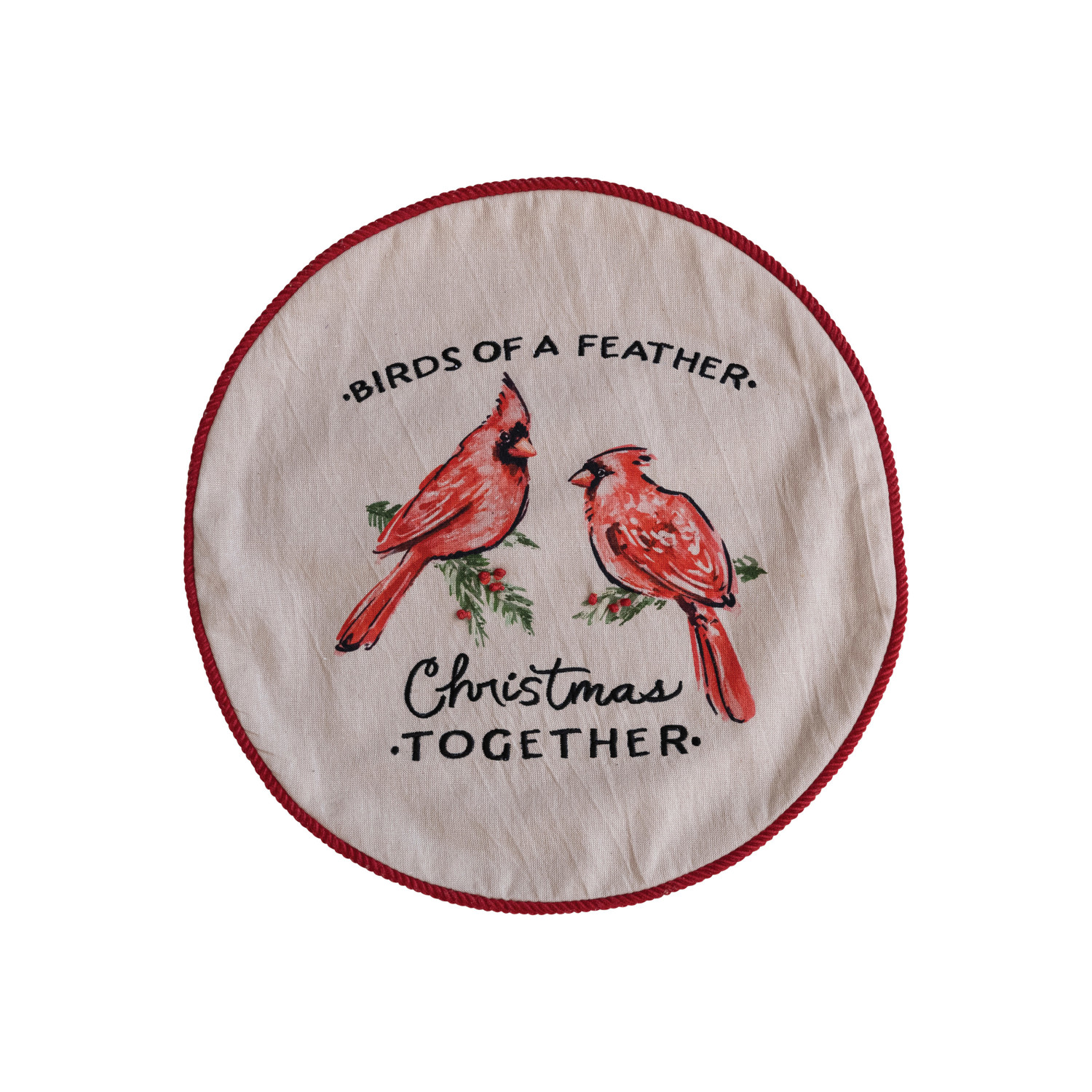 Catalog Name: 16" Round Cotton Printed Pillow w/ Cardinals, Embroidery & Corduroy Back "Birds Of A Feather, Christmas Together", Multi Color ©