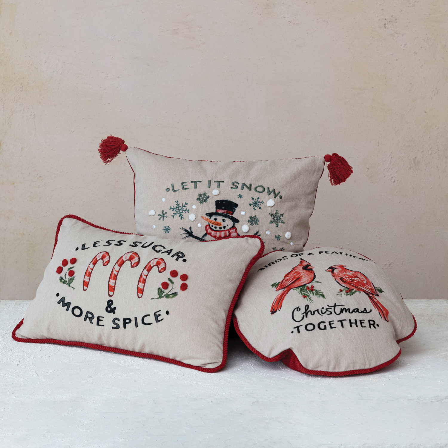 This corduroy-backed cotton pillow is a celebration of holiday companionship, featuring a printed and embroidered design of cardinals that symbolize joy and togetherness. The phrase "Birds Of A Feather, Christmas Together" frames the scene, set against a backdrop of multicolored cotton fabric. The corduroy back adds a touch of luxury and comfort, making it a perfect addition to any festive setting. With a diameter of 16 inches, it's the ideal size for adding a touch of holiday cheer to the home. The polyester fill ensures a plush feel, inviting everyone to relax and enjoy the season's greetings. Whether it's part of the Christmas tradition or a new addition to the decor, this pillow is sure to bring smiles and warmth to the celebrations. A delightful scene of cardinals, captured in vibrant print and embroidery, adorns this round cotton pillow, echoing the sentiment "Birds Of A Feather, Christmas Together". An ideal piece to bring festive warmth, it pairs perfectly with cozy throws and seasonal decor. A plush polyester fill gives this pillow a full, firm shape.