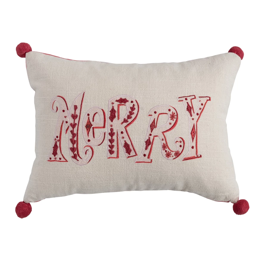 Catalog Name: 20"L x 14"H Slub Printed Lumbar Pillow w/ Embroidery, Beads, Pom Poms & Velvet Back "Merry", Pink, Red & Cream Color ©