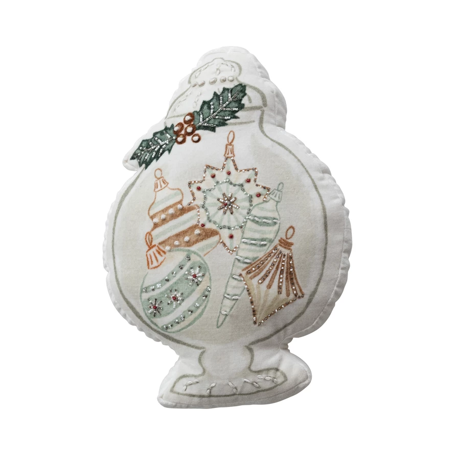 Catalog Name: 15"L x 10"W Velvet Printed Candy Jar Shaped Pillow w/ Holiday Ornaments, Holly, Beads & French Knots, Multi Color ©