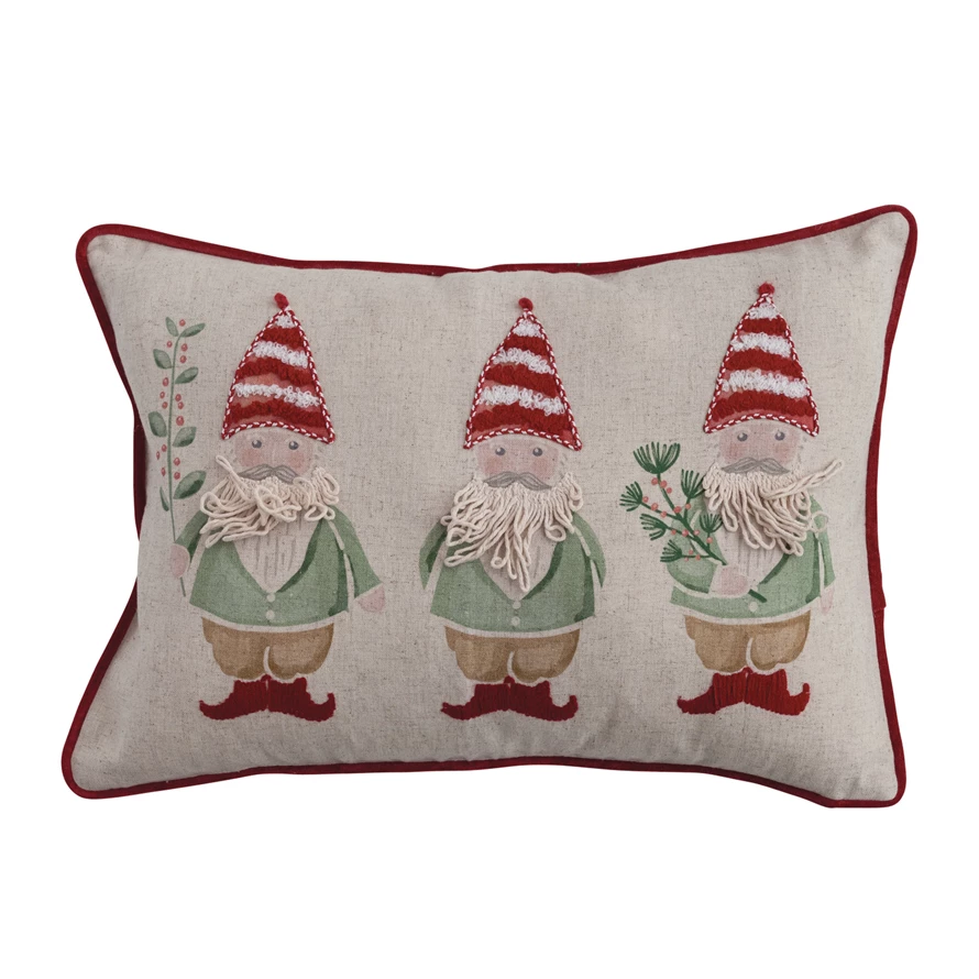 Cotton & Linen Printed Lumbar Pillow with Embroidered Gnomes ©