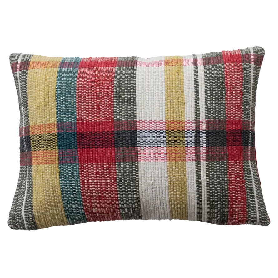 Catalog Name: 24"L x 16"H Hand-Woven Cotton Chindi Lumbar Pillow w/ Red Velvet Back, Multi Color Plaid
