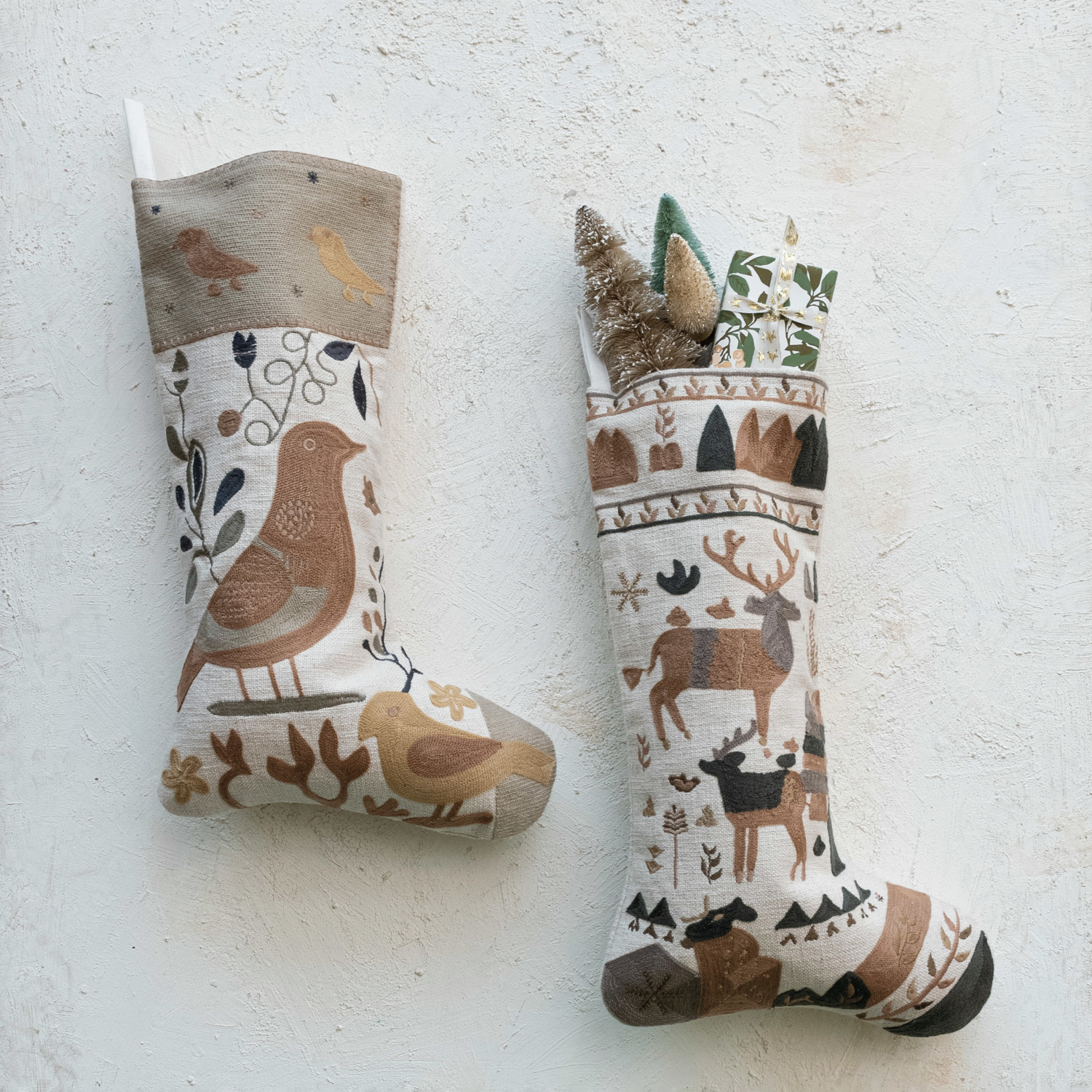 Catalog Name: 20"H Cotton & Linen Stocking w/ Embroidered Birds/Reindeer, Multi Color, 2 Styles