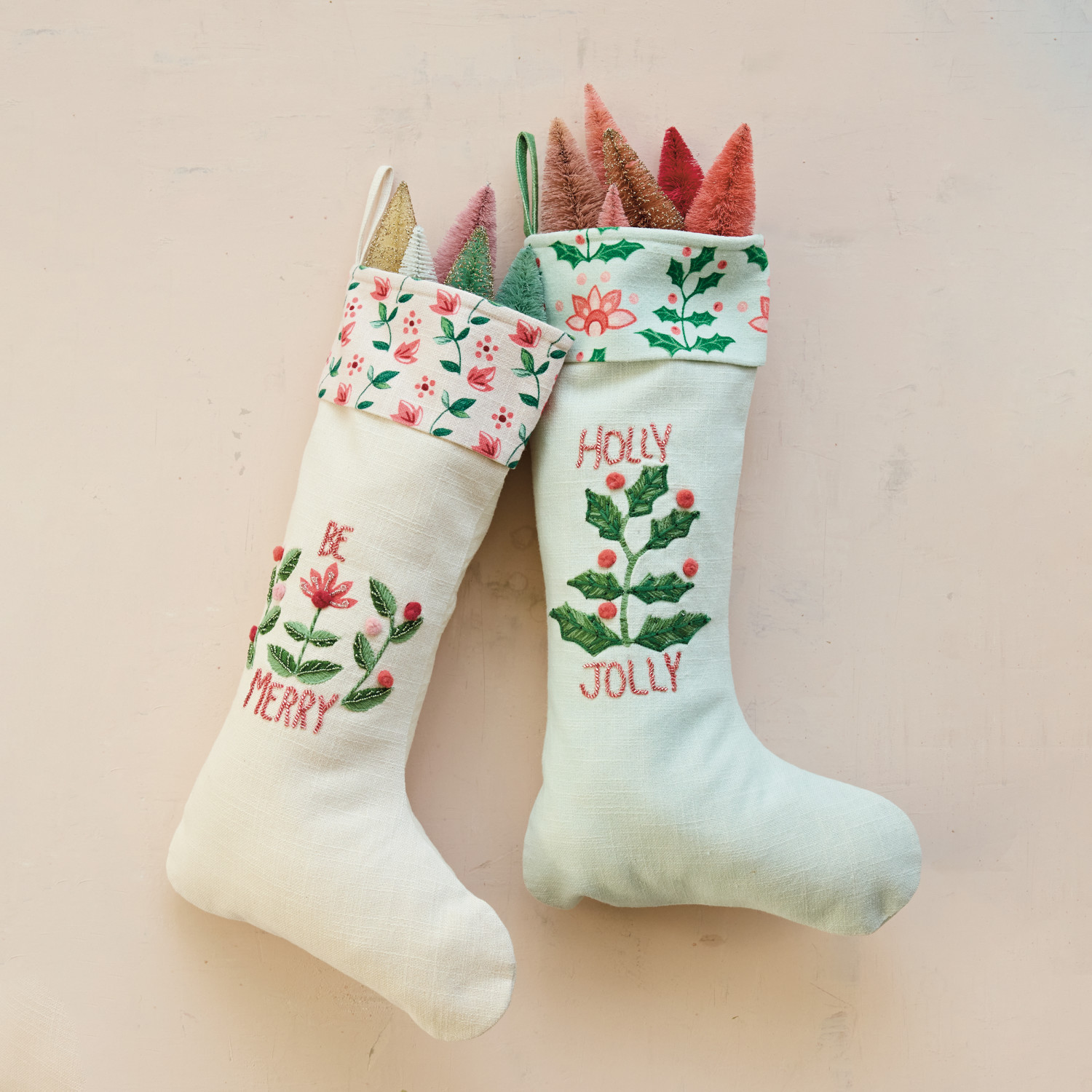 Catalog Name: 20"H Cotton Printed Stocking w/ Holiday Botanicals, Saying, Embroidery, Beads & Patterned Cuff, Multi Color, 2 Styles ©