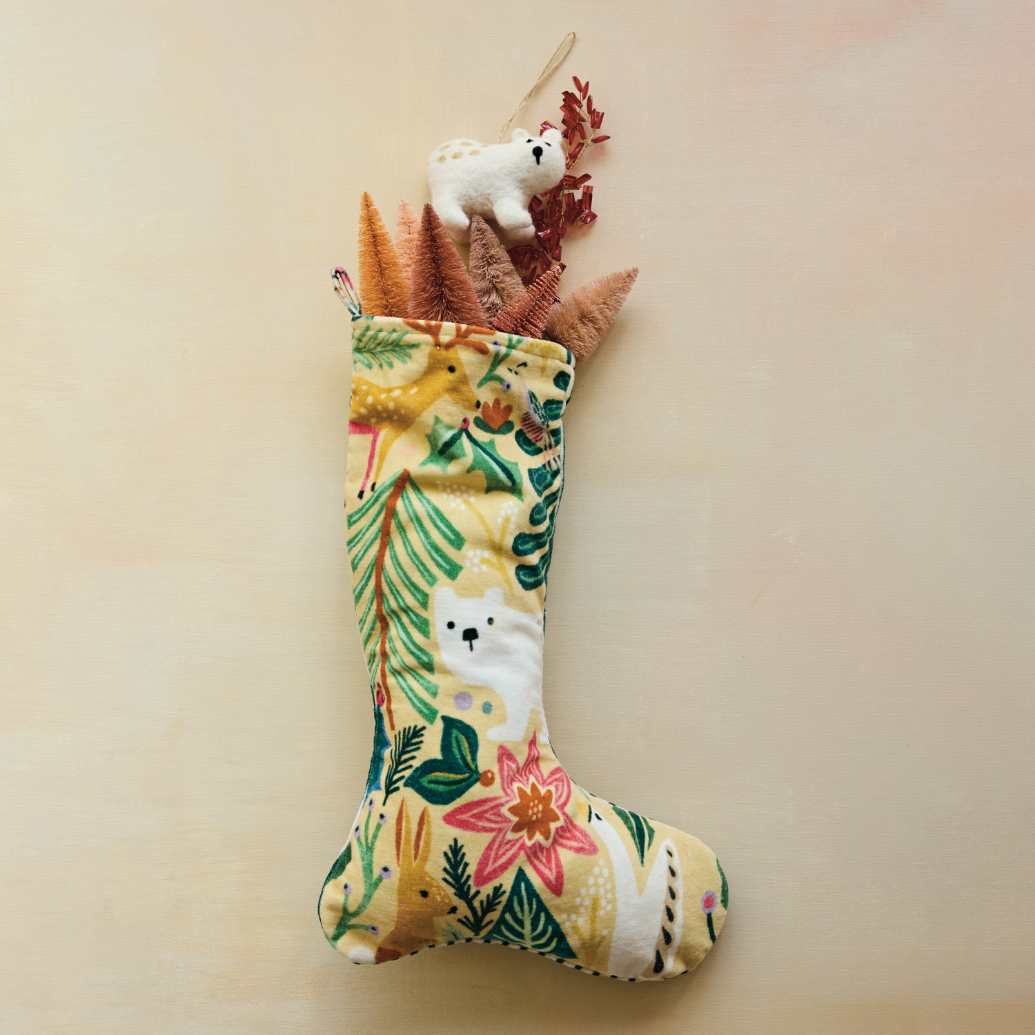 Cotton Velvet Printed Stocking with Animals, Seasonal Botanicals & Striped Back ©