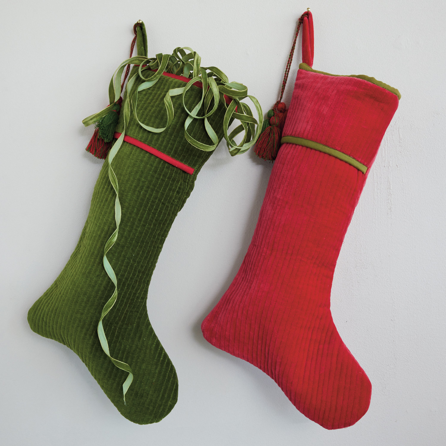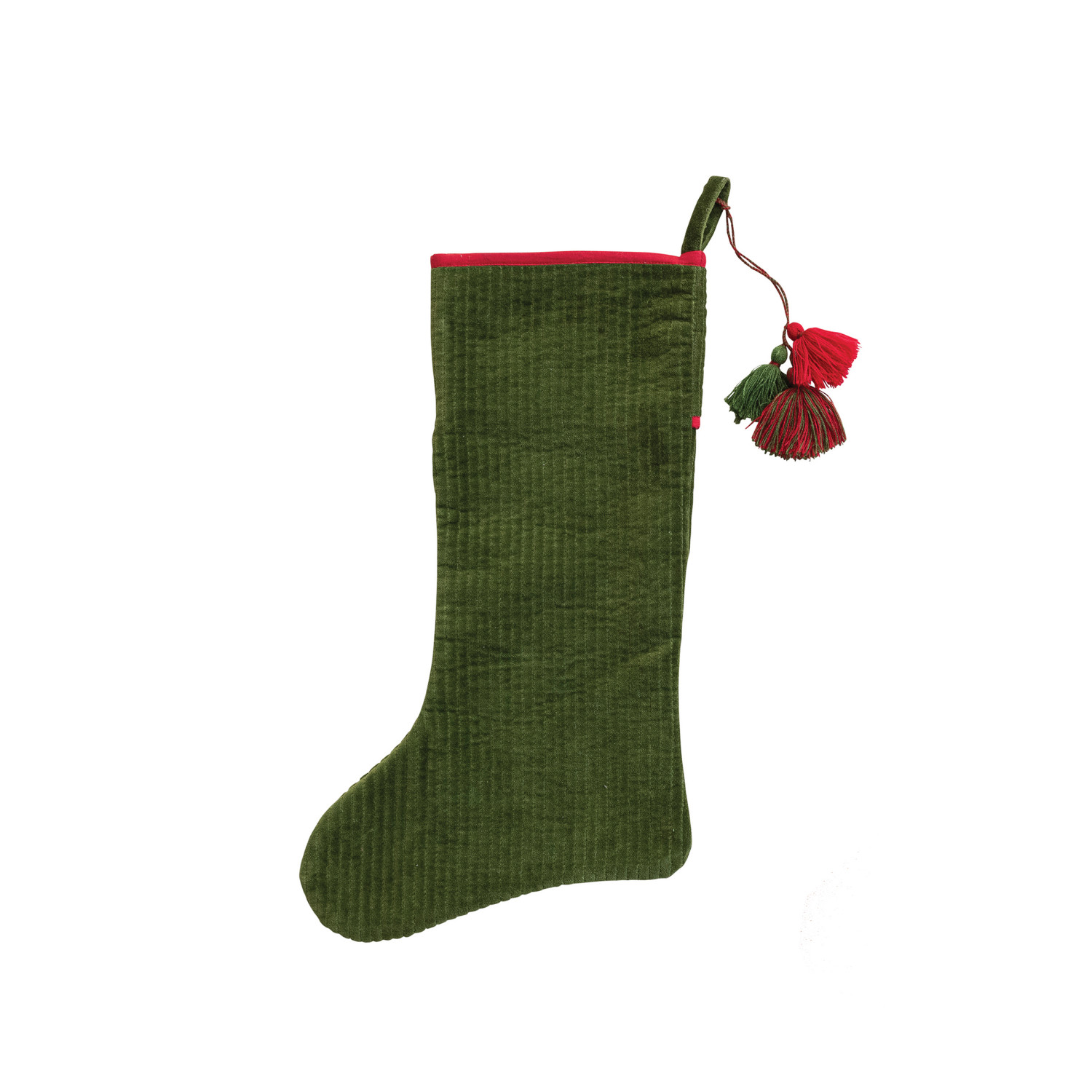Cotton Velvet Quilted Stocking with Tassels, Green & Red