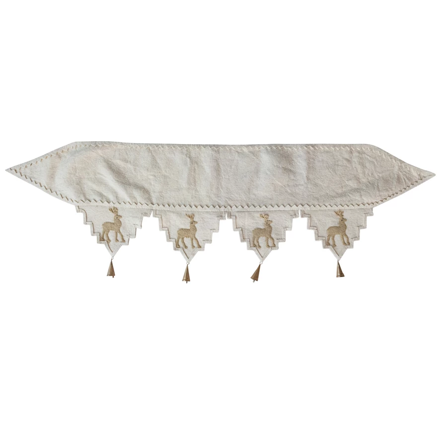 Catalog Name: 69"L x 10-1/2"W Handmade Wool Felt Pennant Mantle Scarf w/ Deer & Gold Finish Metal Bells, Cream & Tan Color
