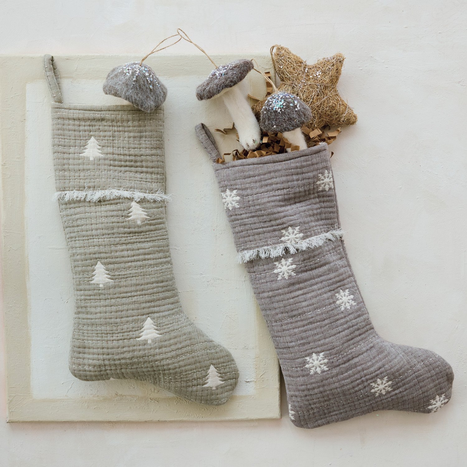 Catalog Name: 20"H Woven Cotton Double Cloth Stocking w/ Trees, Eyelash Fringe & Hand-Embroidered Kantha Stitch, Sage Color & Natural