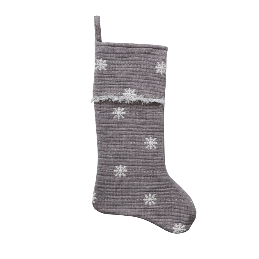 Catalog Name: 20"H Woven Cotton Double Cloth Stocking w/ Snowflakes, Eyelash Fringe & Hand-Embroidered Kantha Stitch, Grey & Natural