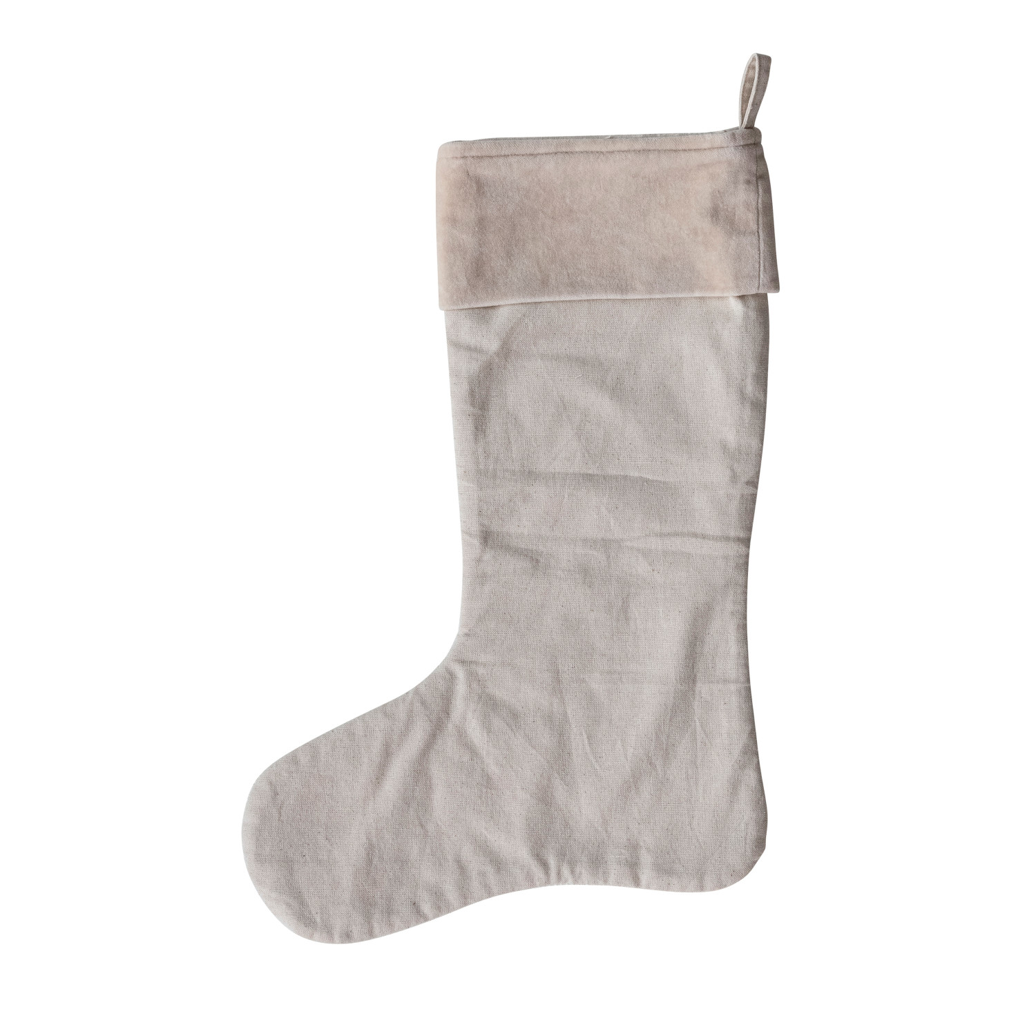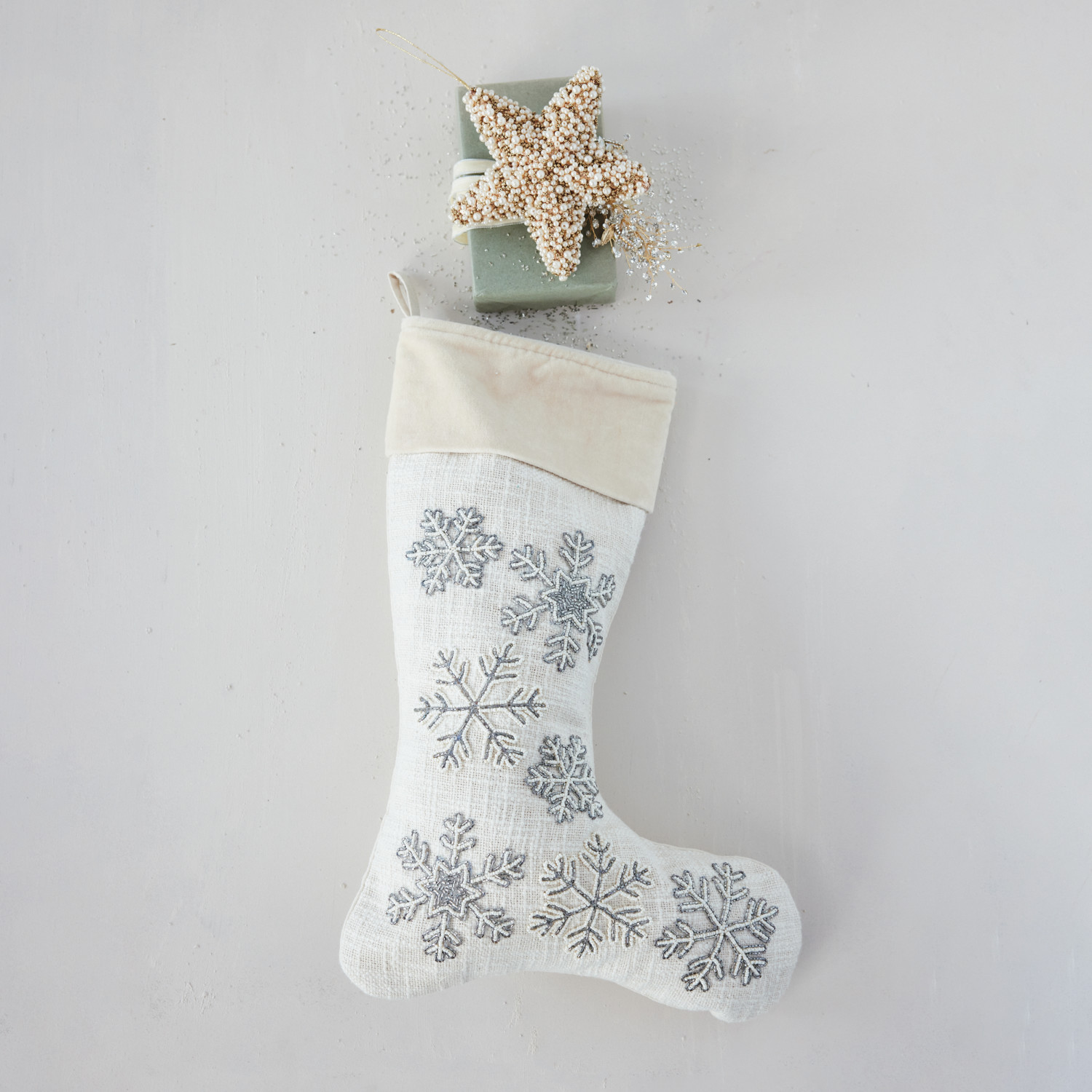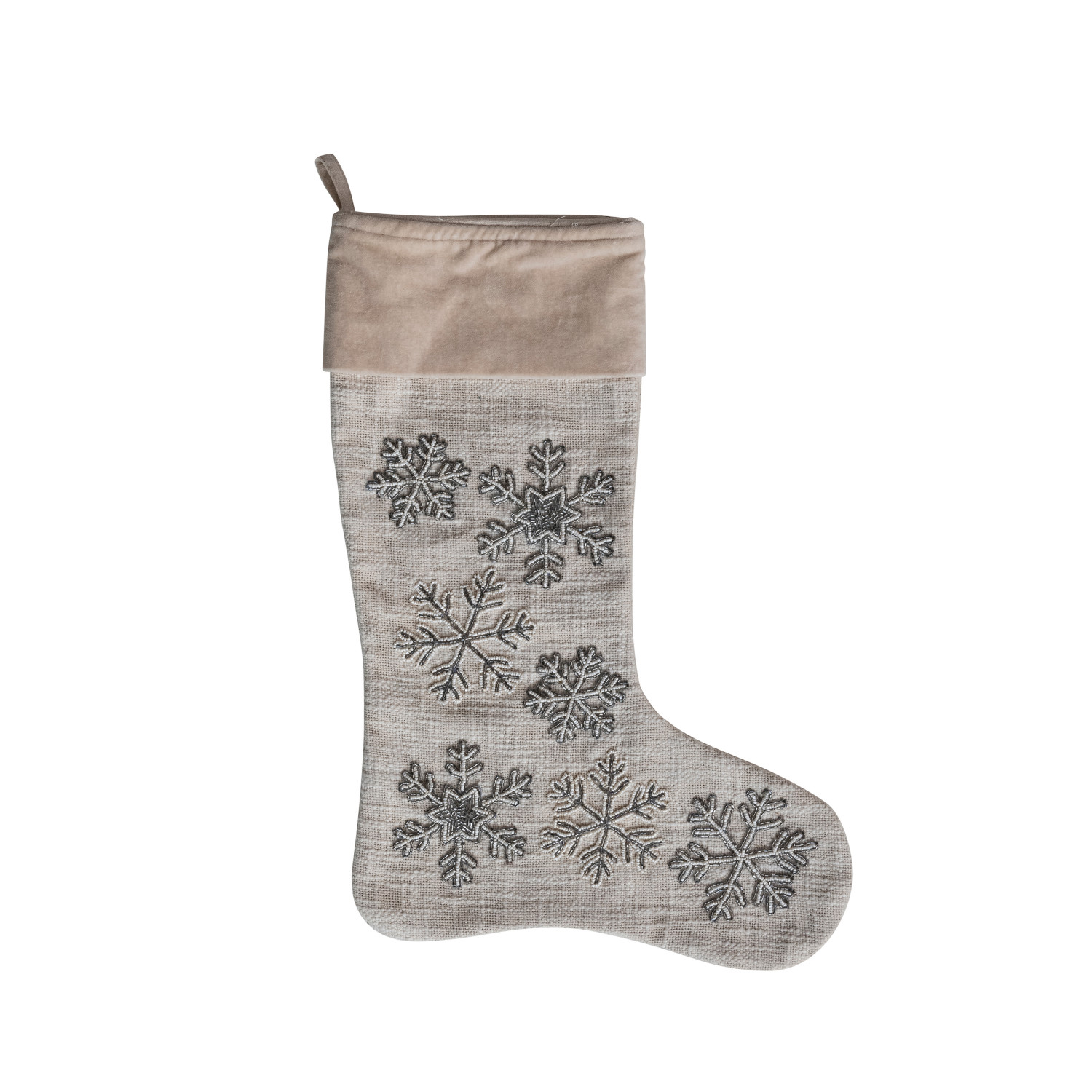 Catalog Name: 20"H Cotton Slub Stocking w/ Velvet Cuff, Embroidered Snowflakes & Beads, Cream Color & Blue