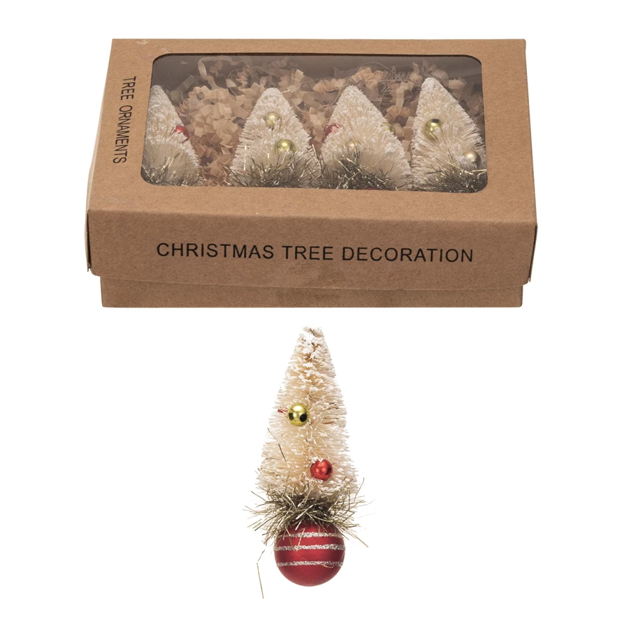 Catalog Name: 1-1/4" Round x 3-1/2"H Sisal Bottle Brush Tree Ornaments w/ Beads, Glass Ball Base & Glitter, Red & Cream Color, Boxed Set of 4