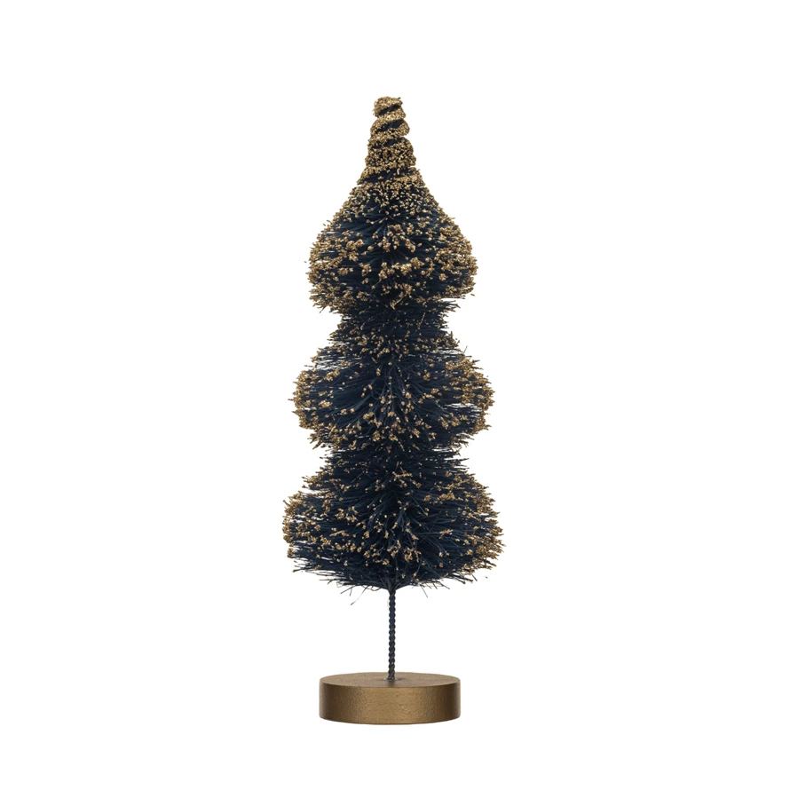 Catalog Name: 4-1/2" Round x 11"H Sisal Bottle Brush Tree w/ Gold Glitter & Wood Base, Blue