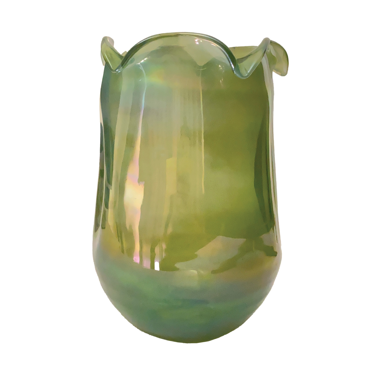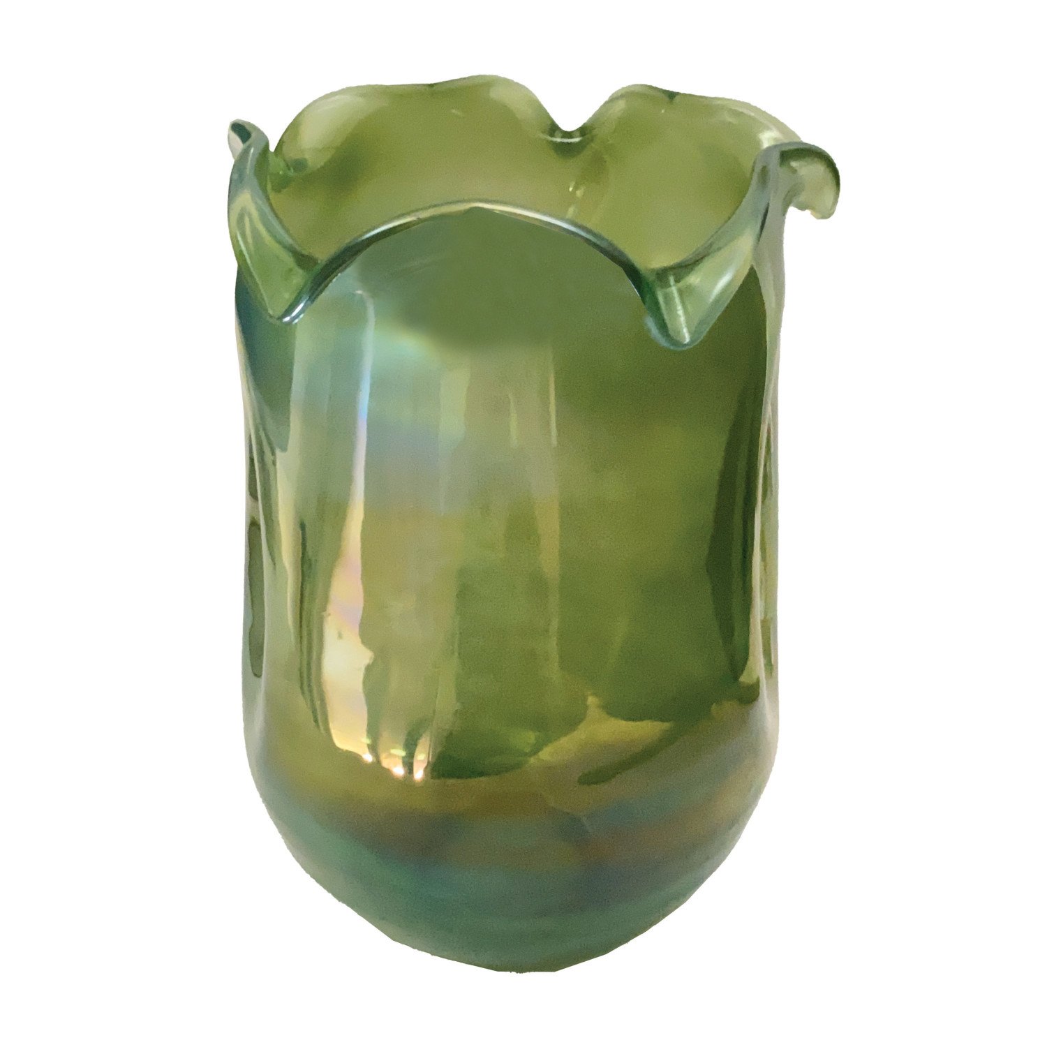 Catalog Name: 8" Round x 11-1/2"H Handmade Glass Candle Holder/Vase w/ Ruffled Edge, Iridescent Finish, Green
