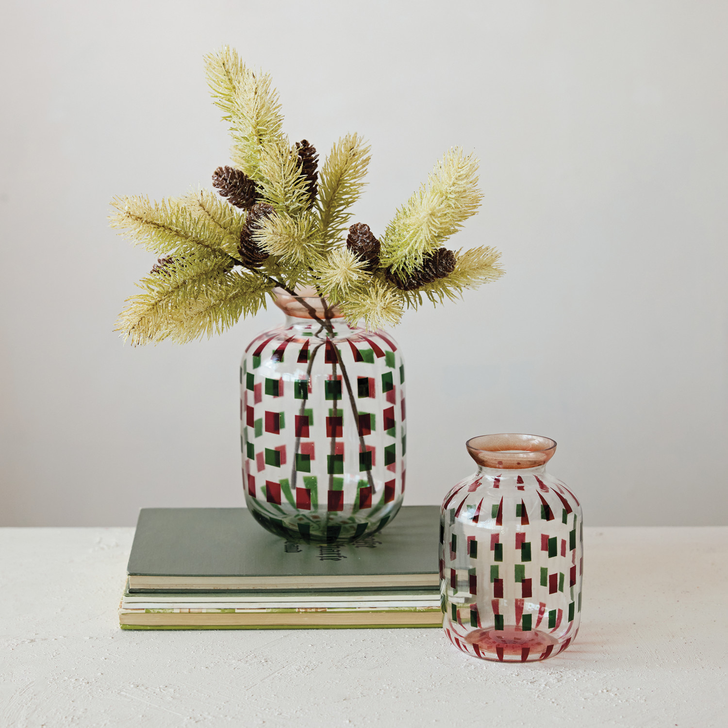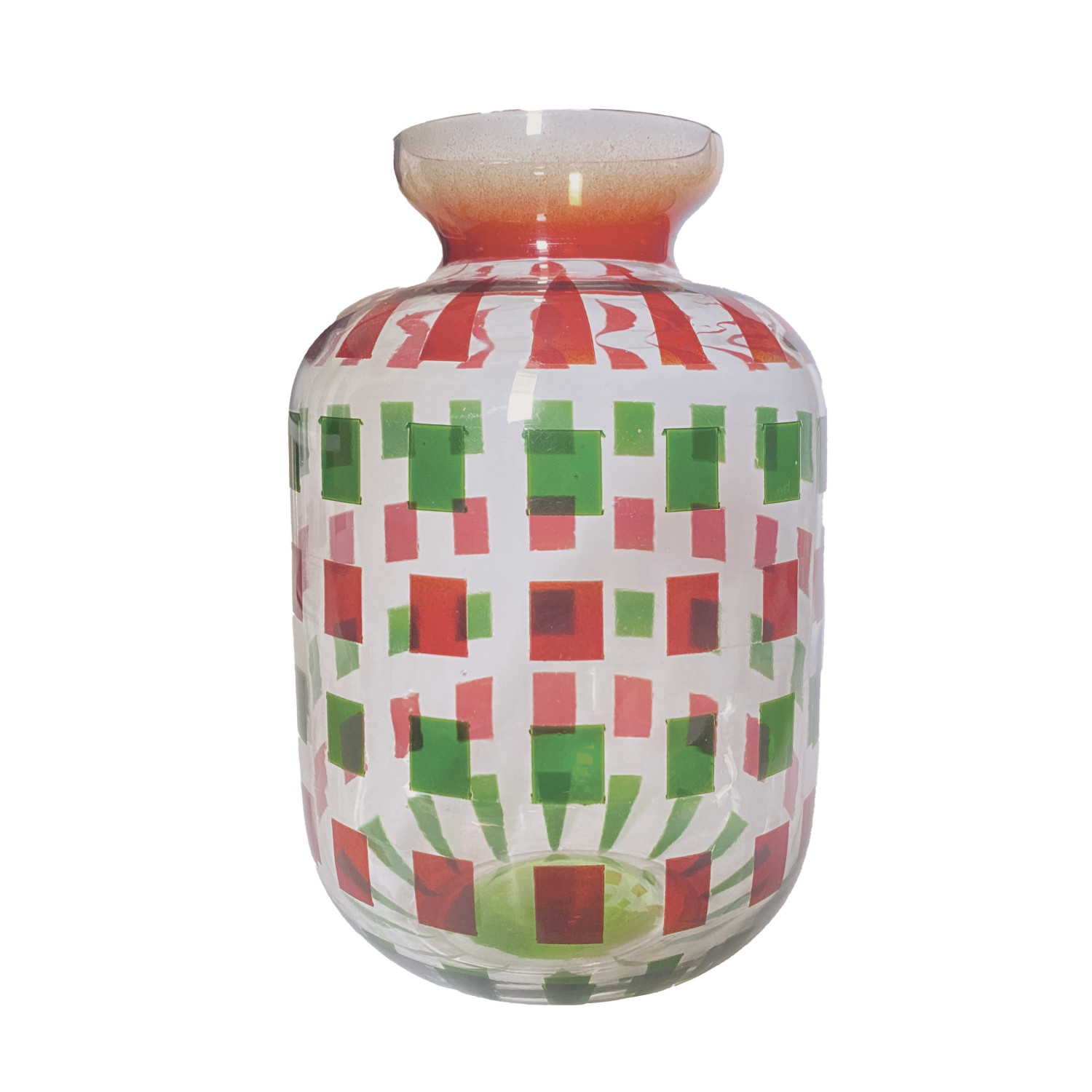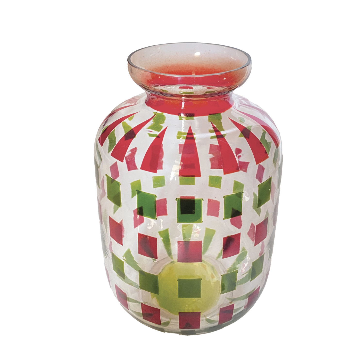 Painted Glass Vase with Geometric Pattern, Red & Green