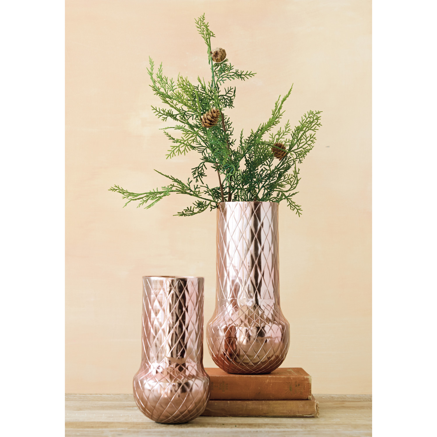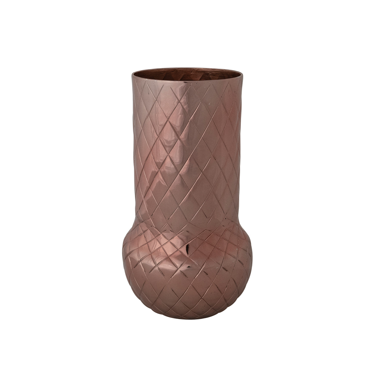 Catalog Name: 5" Round x 9-1/4"H Metal Vase w/ Diamond Pattern, Copper Finish