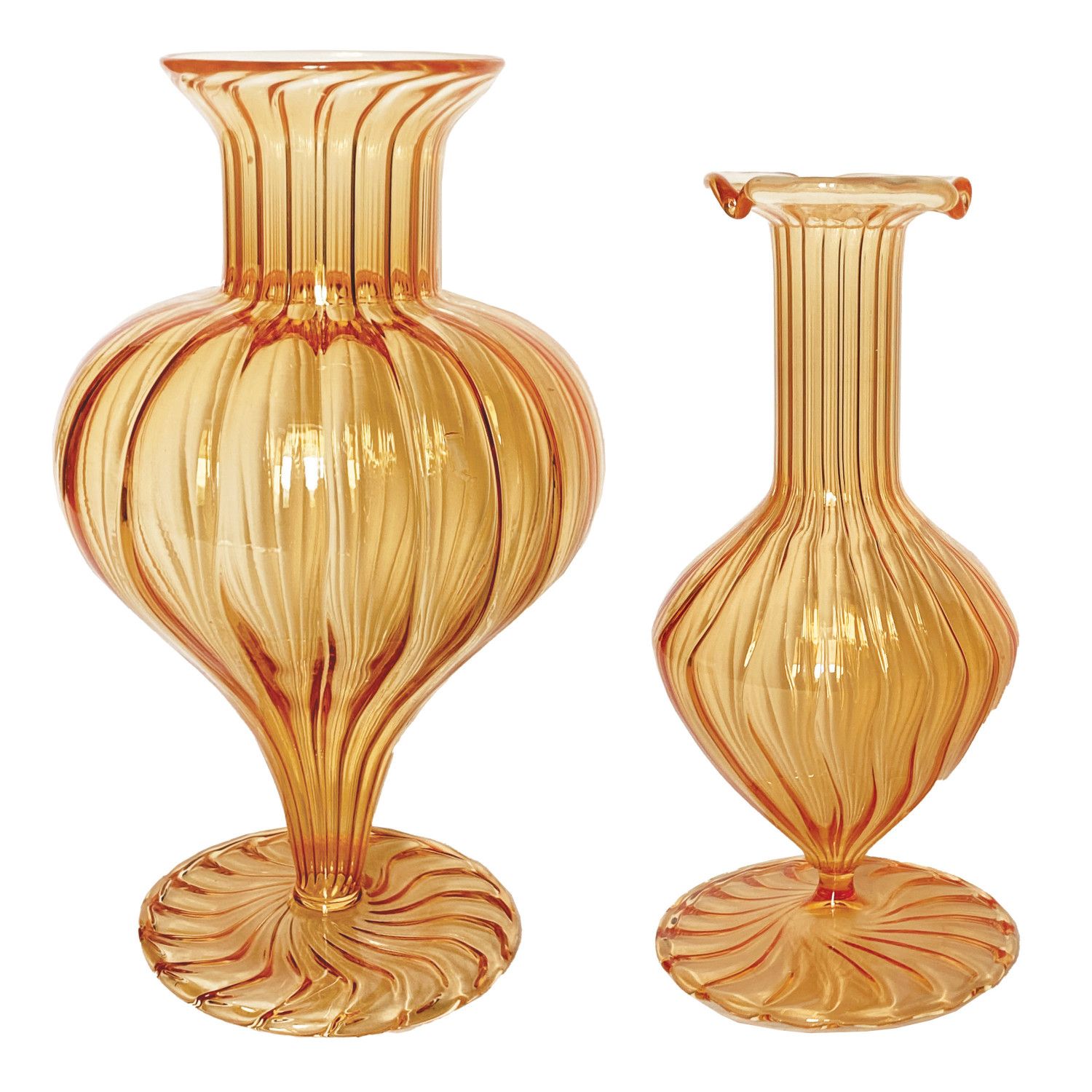 Catalog Name: 7-1/2"H - 8-1/2"H Hand-Blown Fluted Glass Footed Vase, Apricot Color, 2 Styles