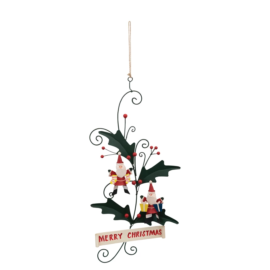7"W x 12-1/2"H Hand-Painted Tin Holly Sign with Santas "Merry Christmas", Multi Color
