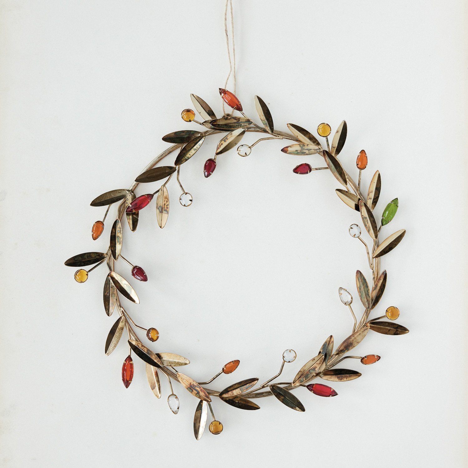 Metal Leaves & Acrylic Bead Berries Wreath, Antique Gold Finish & Multi Color
